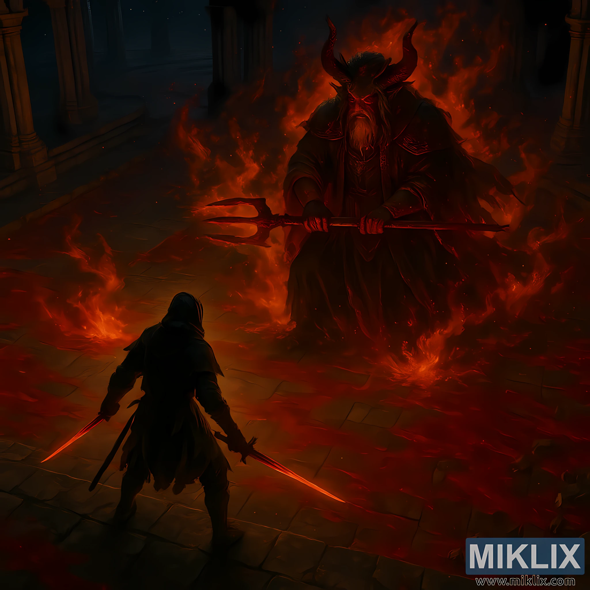 He grips a long, barbed trident with both hands—properly depicted as a single powerful polearm rather than a pair of weapons. The trident’s three prongs glow with a smoldering heat, and the metal seems to vibrate with power. The way he holds it underscores both his control over the arena and his readiness to strike.