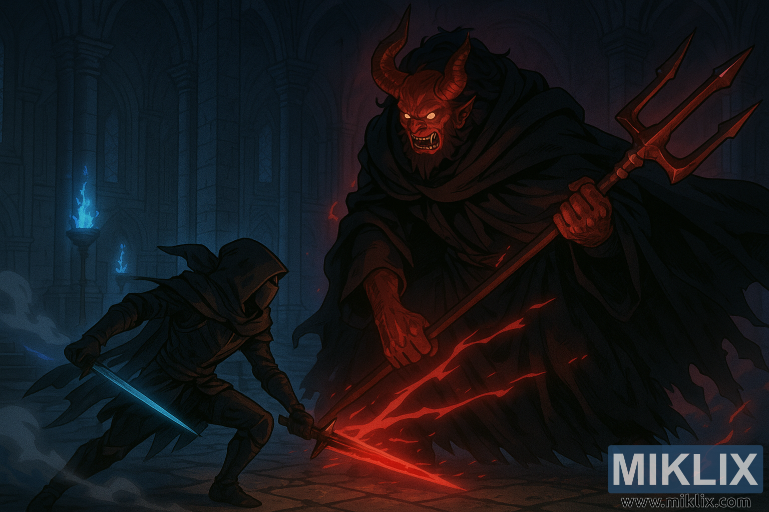 High-detail anime-style artwork of the Tarnished battling Mohg, the Omen in a cathedral — blue and red lighting, huge dark-robed Mohg wielding a trident, intense action composition.