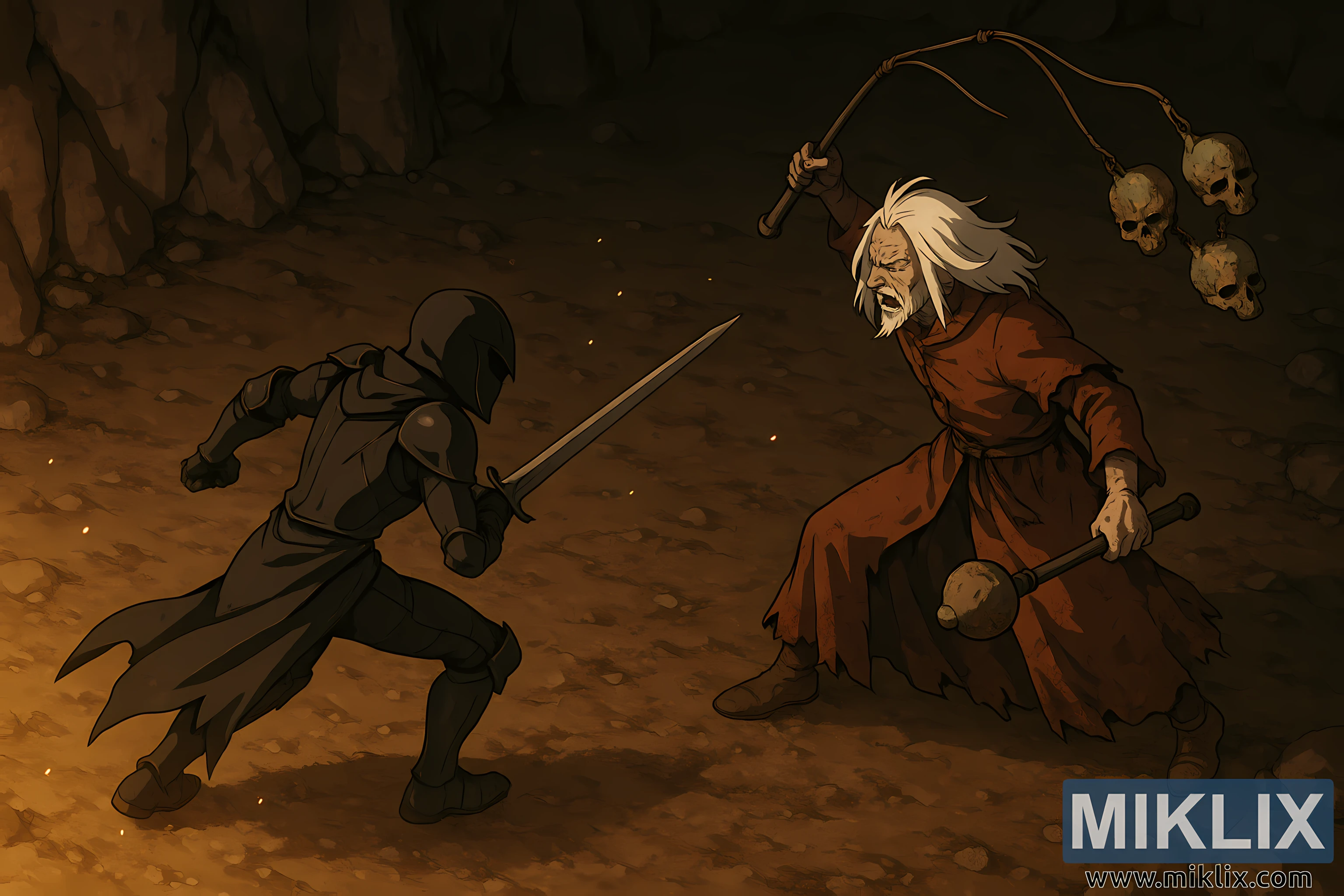 Opposite, on the right side, is Necromancer Garris, depicted as an elderly, gaunt sorcerer in tattered, rust-red robes. His long white hair flares outward as if stirred by sudden movement, framing a face twisted with rage. Deep wrinkles, sunken cheeks, and a snarling mouth communicate both age and ferocity. Garris’s posture is aggressive and unbalanced, one foot planted forward as he lunges into the confrontation.