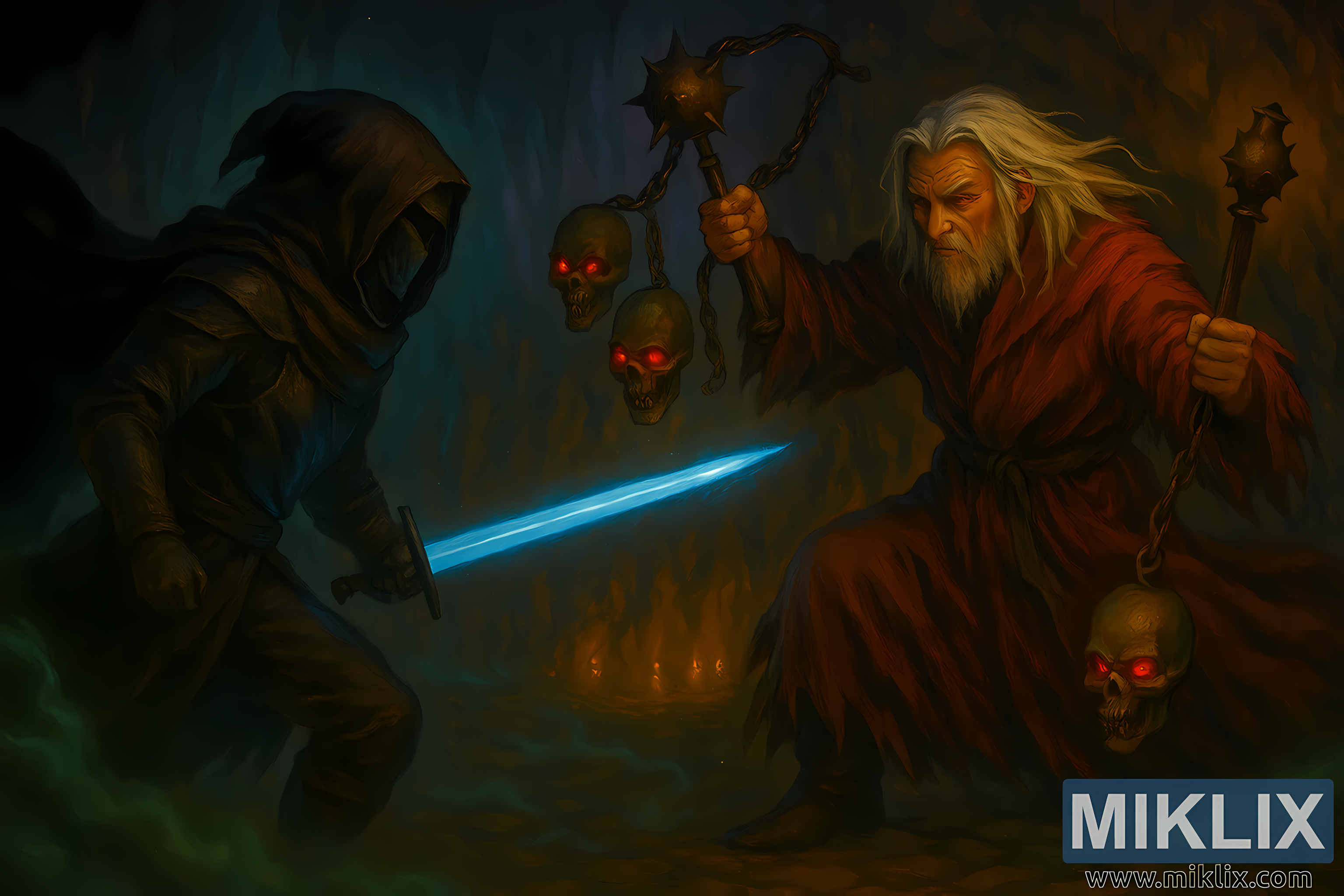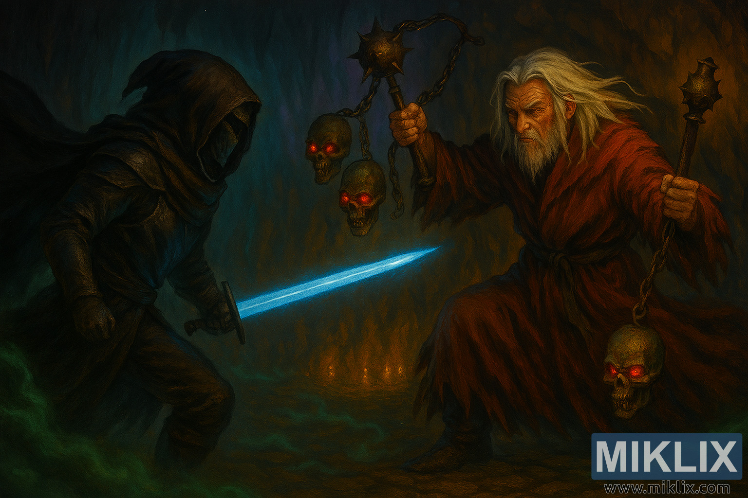 The image’s color palette blends cool tones on the left with warm tones on the right, enhancing the visual tension between the characters. The semi-realistic rendering emphasizes expressive motion, detailed armor and robes, and magical energy. The composition is balanced, with the characters’ weapons and stances forming diagonal lines that converge at the center, drawing the viewer’s eye into the heart of the battle.