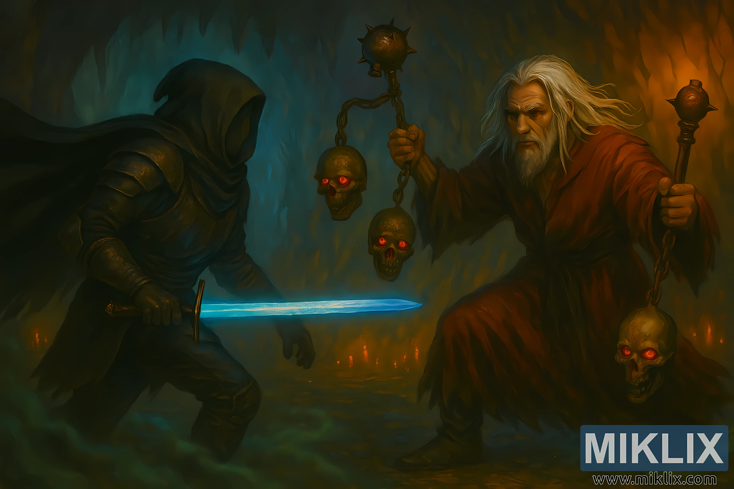 The image’s color palette blends cool tones on the left with warm tones on the right, enhancing the visual tension between the characters. The semi-realistic rendering emphasizes expressive motion, detailed armor and robes, and magical energy. The composition is balanced, with the characters’ weapons and stances forming diagonal lines that converge at the center, drawing the viewer’s eye into the heart of the battle.