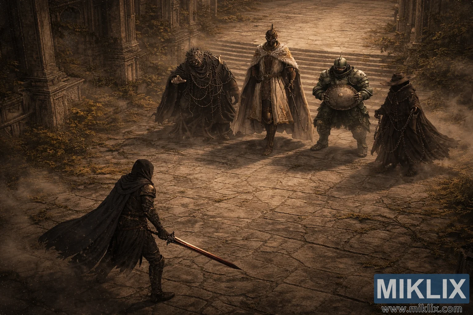 Semi-realistic isometric fan art from Elden Ring: Shadow of the Erdtree depicting the Tarnished confronting four imposing enemies in the ancient ruins of Enir-Ilim before battle.