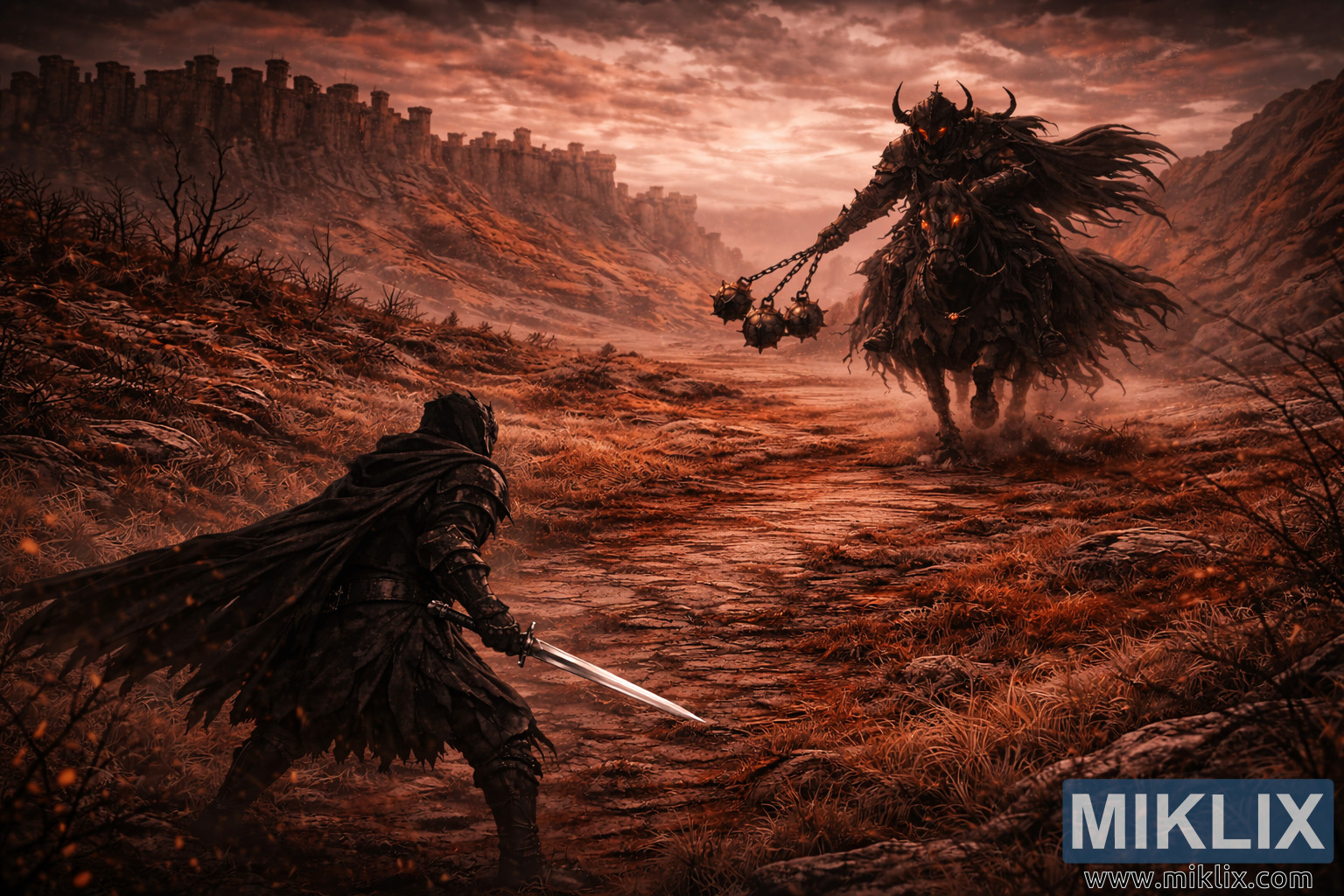 Across the cracked road to the upper right, the Night’s Cavalry advances on a skeletal black horse. The rider’s silhouette is sharp and brutal, with a horned helm, jagged pauldrons, and a cloak that trails like torn banners in a storm. The three-balled flail is lifted outward, its heavy spiked heads hanging from dark chains that arc toward the ground, emphasizing the boss’s looming reach even at a distance. The horse’s eyes burn with a dull ember glow, echoing the countless sparks that drift across the landscape.