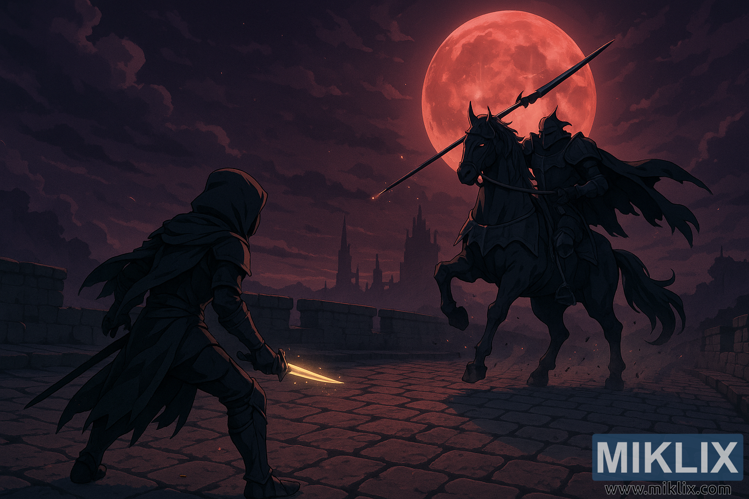 Small glowing embers drift through the air, adding a subtle magical quality to the composition and suggesting a world suffused with danger and arcane power. The contrast between the Tarnished’s small but fiercely bright dagger and the towering, red-lit silhouette of the Night’s Cavalry underlines the core theme of the piece: a lone, determined warrior facing a towering, almost overwhelming foe. Altogether, the image captures the haunting beauty, oppressive atmosphere, and high-stakes dueling that define Elden Ring’s world.