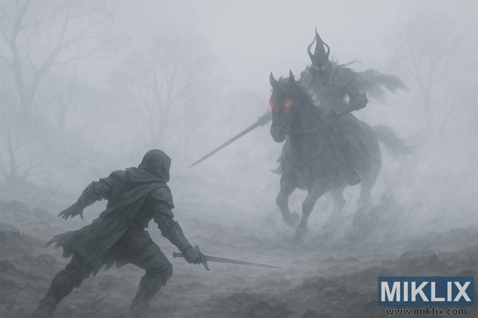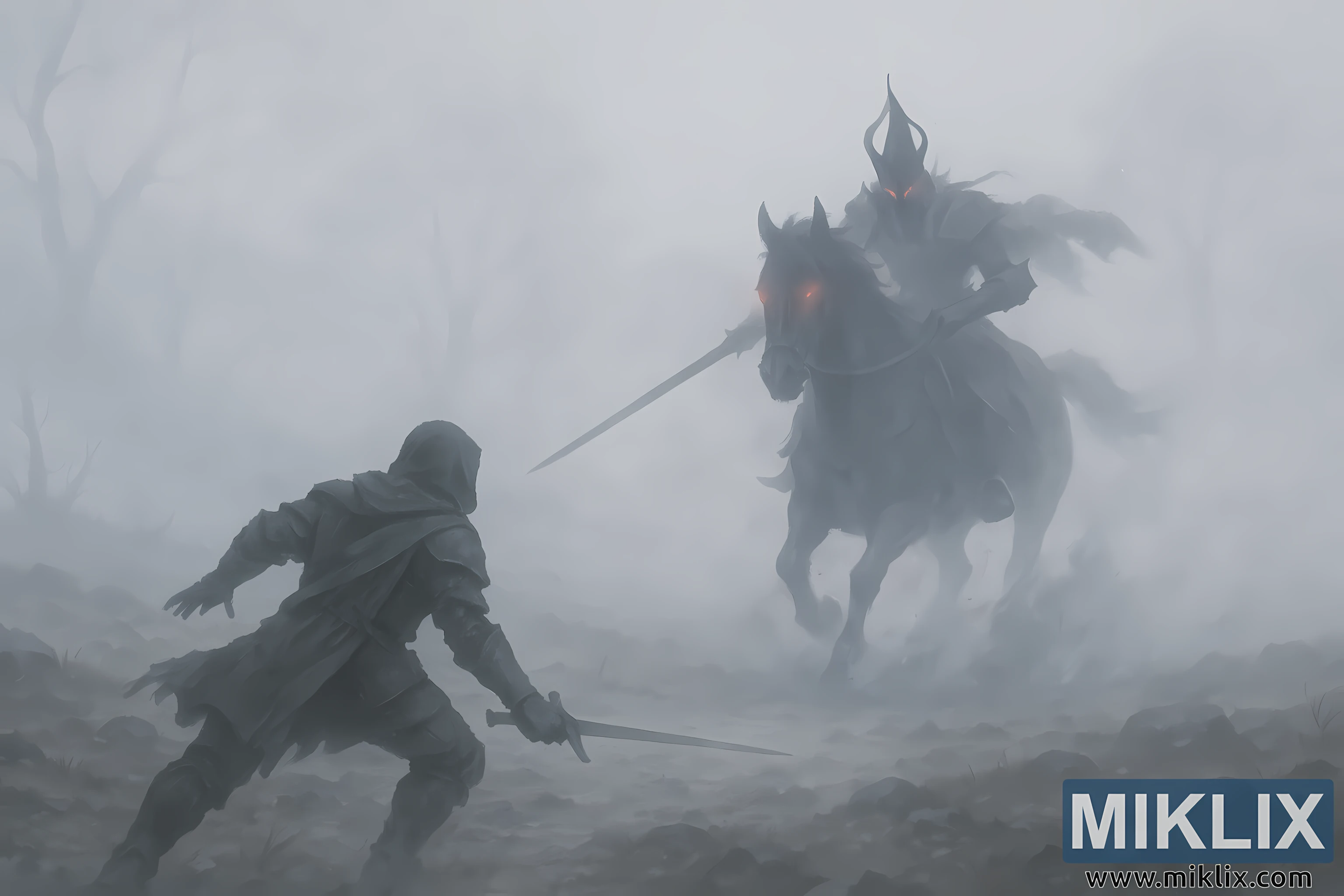 Across from him — but separated by a gulf of pale air that feels deeper than the space it occupies — looms the Night's Cavalry mounted atop its spectral black steed. Only the most essential details survive the suffocating mist: the horned crest of the helm, jagged shoulders of armor, the shifting curtain of the rider's cloak, and most of all, the burning red eyes of both rider and horse. These eyes are the only vivid points of contrast in the scene, glowing like embers in ash, creating a sense of predatory intelligence gliding forward through unreality. The glaive is held forward in a ready posture, its blade long, slender, and ghostlike — almost more suggestion than steel, its edge thinning into the white atmosphere.