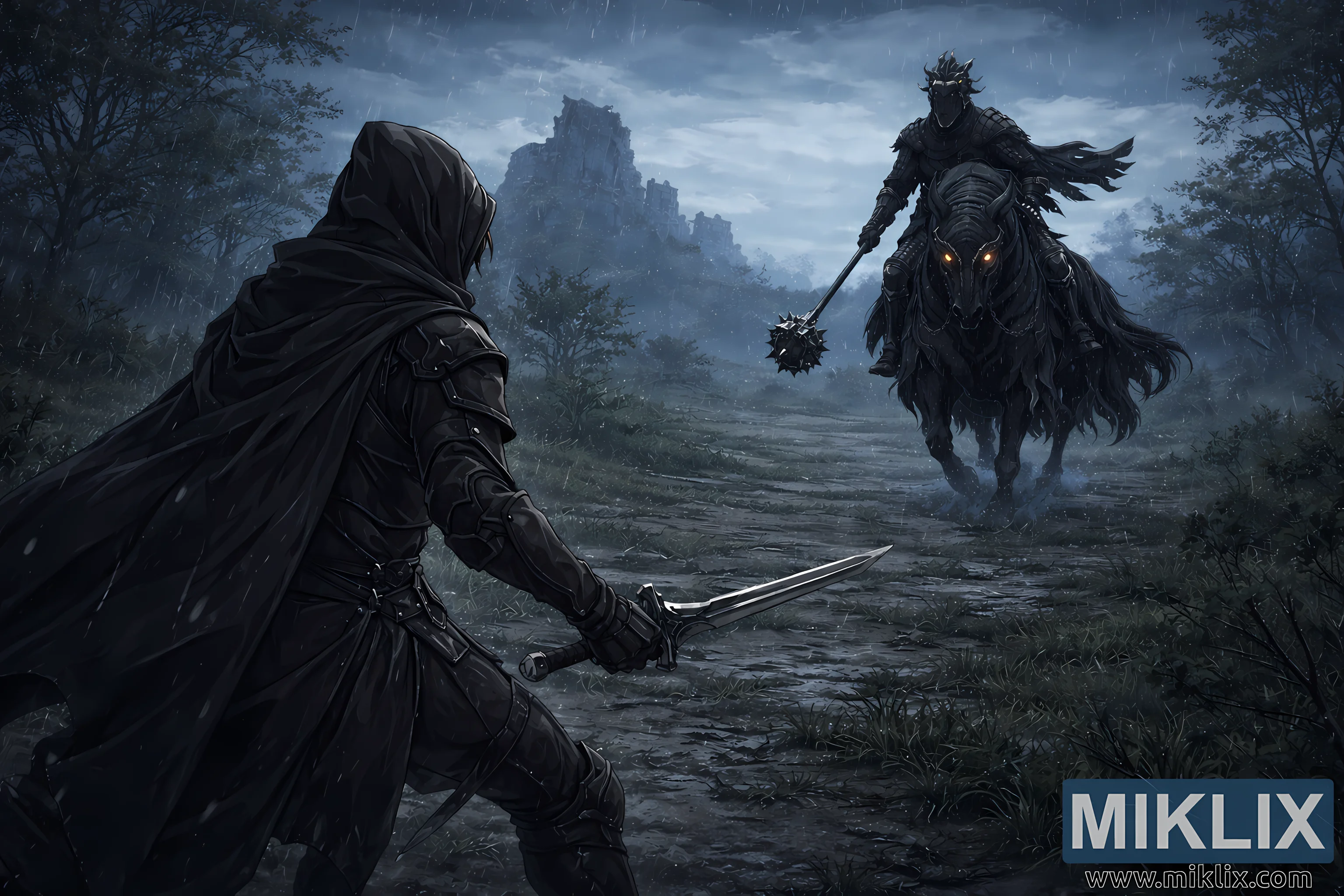 Across the middle distance, the Night’s Cavalry looms on the right side of the composition, mounted atop a towering black warhorse whose silhouette cuts sharply against the mist-shrouded horizon. The rider’s armor is jagged and ominous, adorned with horn-like protrusions and layered plates that create a demonic knightly outline. The horse’s eyes glow with a muted amber light, providing a subtle but striking contrast to the cool palette that dominates the scene. The cavalry’s heavy flail dangles from a relaxed yet threatening grip, its spiked iron head swaying slightly as if moved by the wind alone. With the camera drawn farther back, the space between the two figures becomes more pronounced, emphasizing the psychological tension of distance and anticipation rather than immediate action.