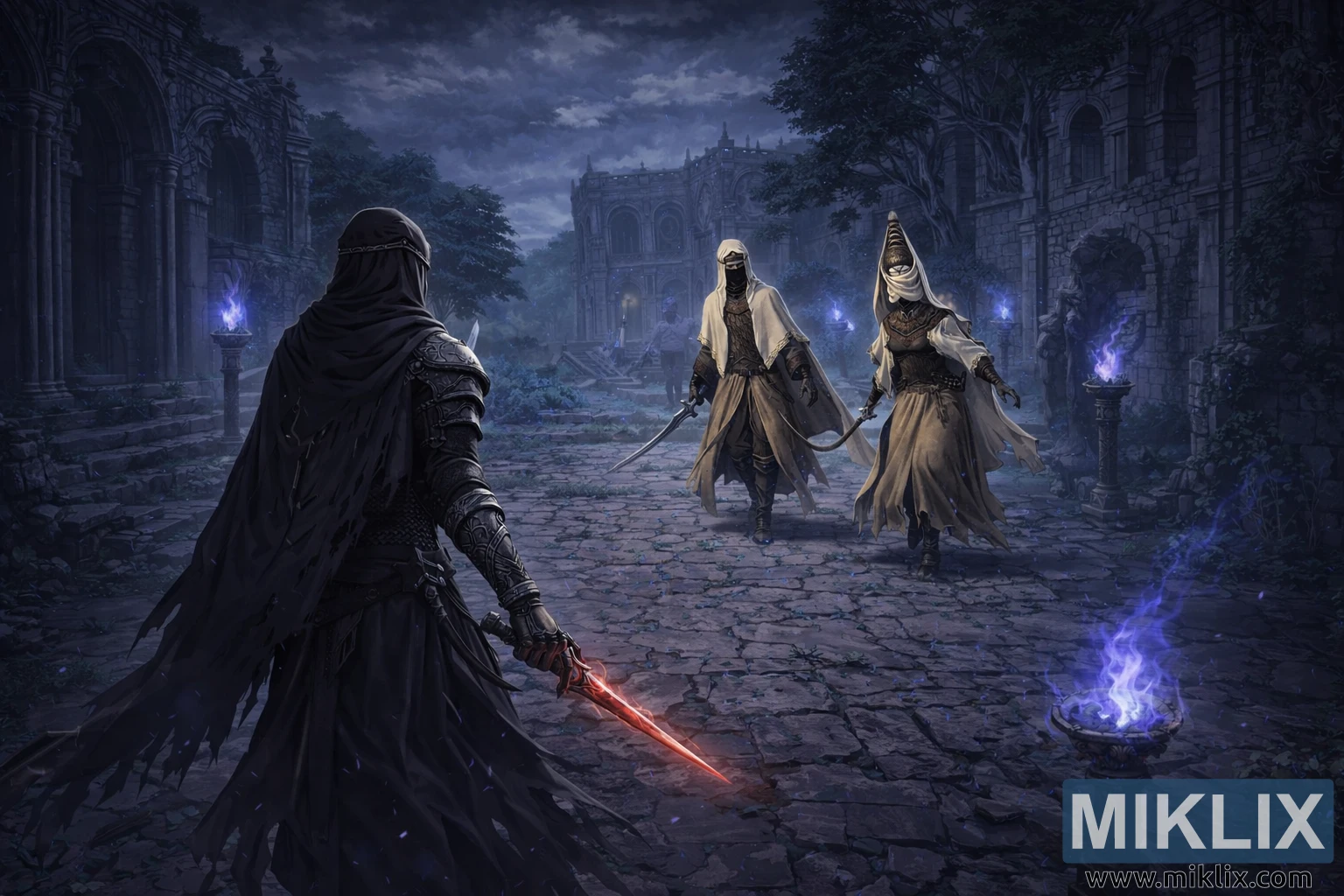 Across the cracked stone roadway, the Nox Swordstress and Nox Monk approach together from the midground. Their pale, flowing robes billow softly as they walk, revealing darker, ornate armor beneath. Their faces remain hidden behind veils and elaborate headdresses, lending them an eerie, inhuman presence. The Swordstress keeps her curved blade low but ready, its silver edge catching the moonlight, while the Monk advances with ritualistic poise, arms slightly out as though drawing upon unseen magic. Their synchronized movement suggests a deadly partnership honed by countless encounters.