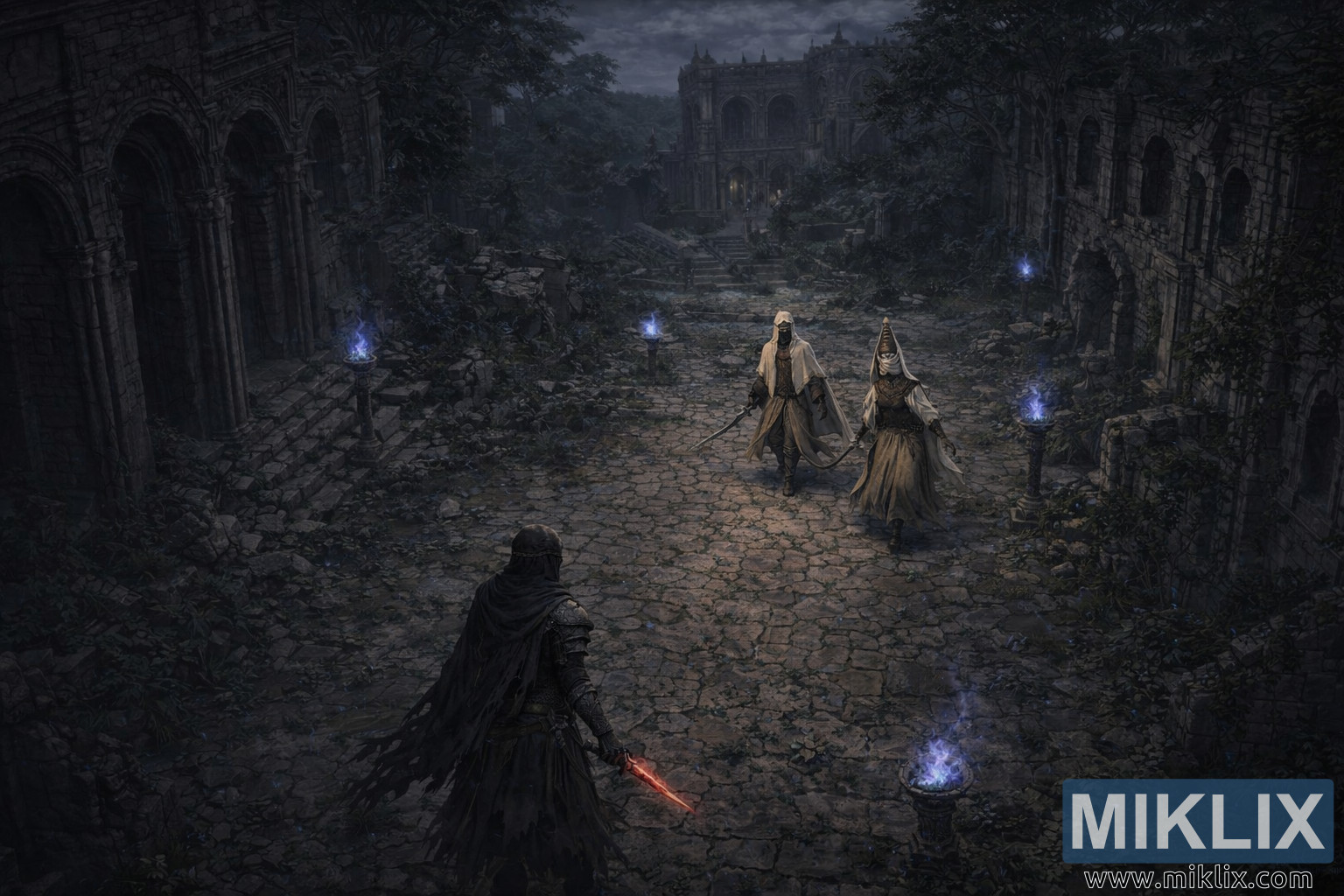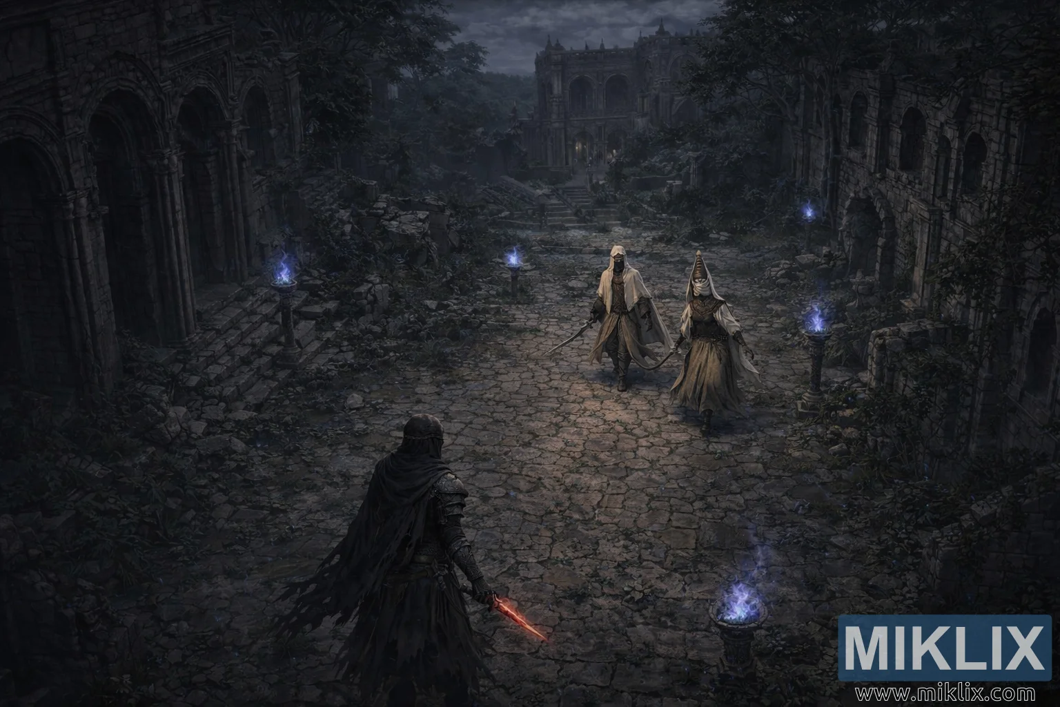 The environment dominates the scene. On both sides of the street, ruined buildings lean inward, their arches shattered, their windows dark hollows staring into nothingness. Ivy and creeping vegetation reclaim the stone, climbing over collapsed walls and fallen stairways. A line of stone braziers runs along the path, each crowned with spectral blue flame that flickers weakly in the night breeze. These ghost lights scatter reflections across damp stones and send long shadows stretching toward the center of the road, visually binding the Tarnished and the Nox warriors in a single field of tension.