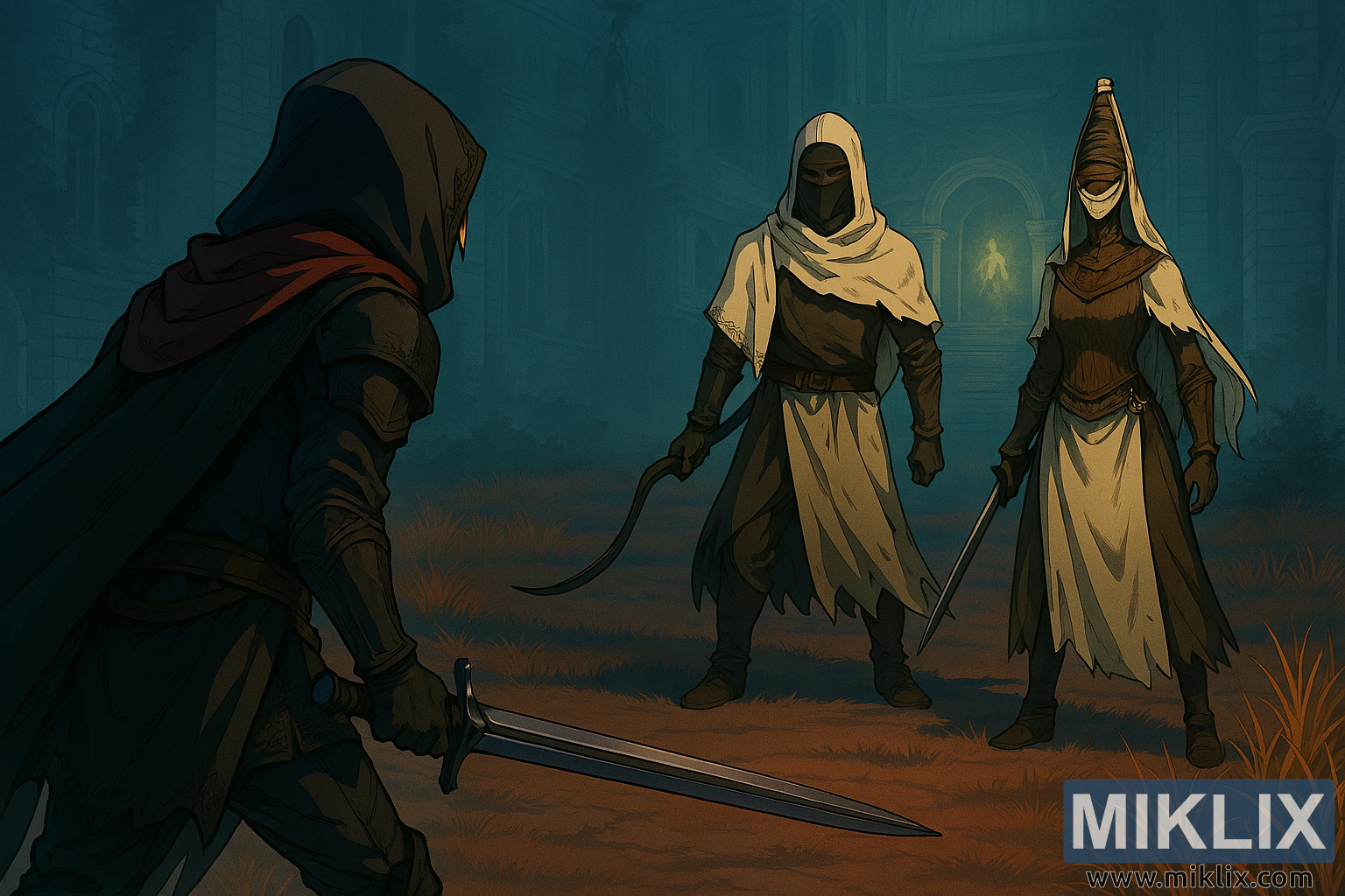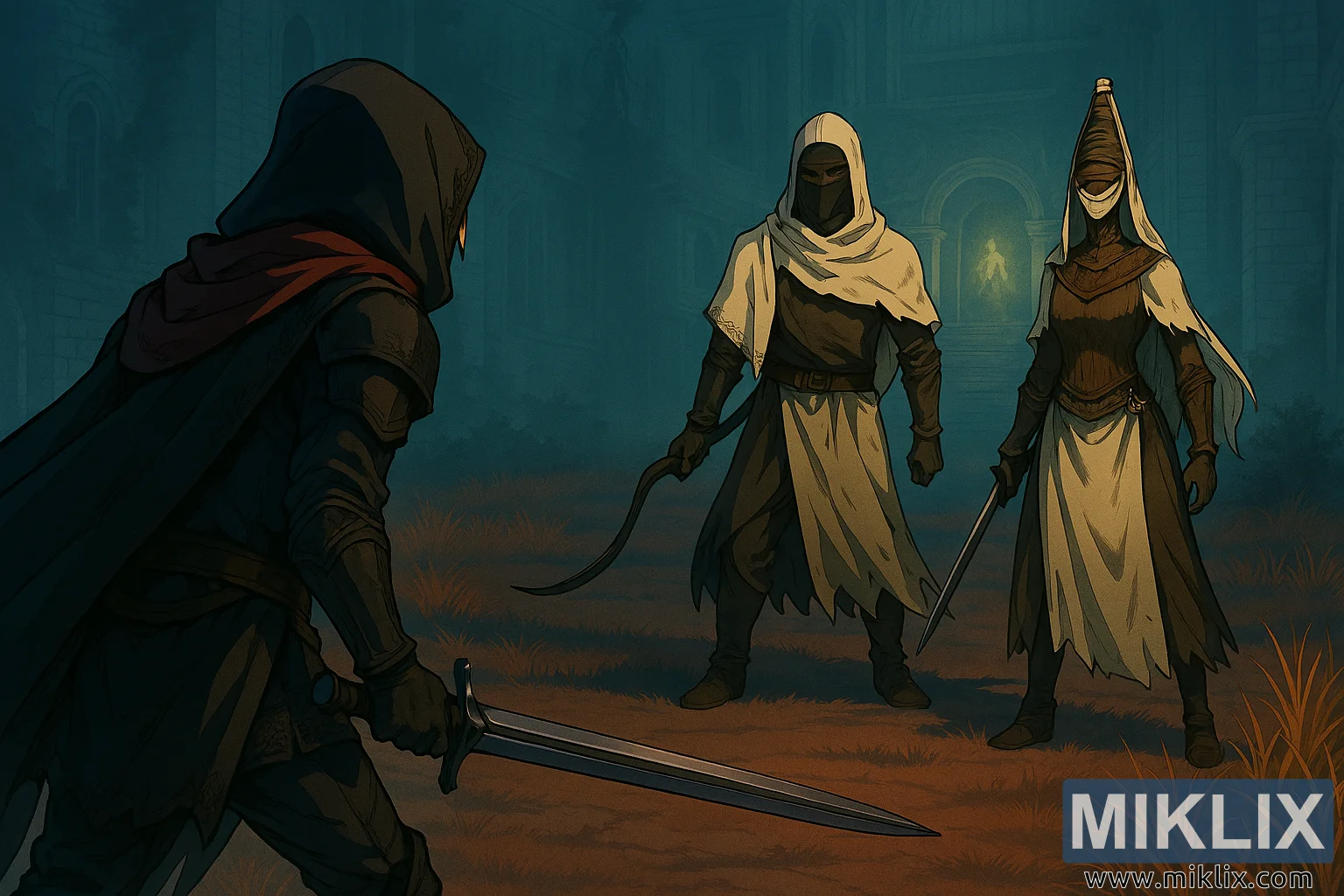 Facing him across the reddish-brown overgrown courtyard are the Nox Swordstress and Nox Monk, two enigmatic and deadly foes. The Nox Monk, to the left, wears a pale hooded robe over dark chainmail and leather armor. His face is obscured by a black veil, and he holds a curved blade with a black hilt in his right hand. His posture is cautious yet threatening. To the right stands the Nox Swordstress, distinguished by her tall, conical headdress that conceals her face entirely, save for a narrow slit revealing glowing red eyes. Her robe is similarly pale, layered over a sleeveless tunic and tattered skirt. She wields a slender, dark sword in her right hand, angled downward in a poised stance.