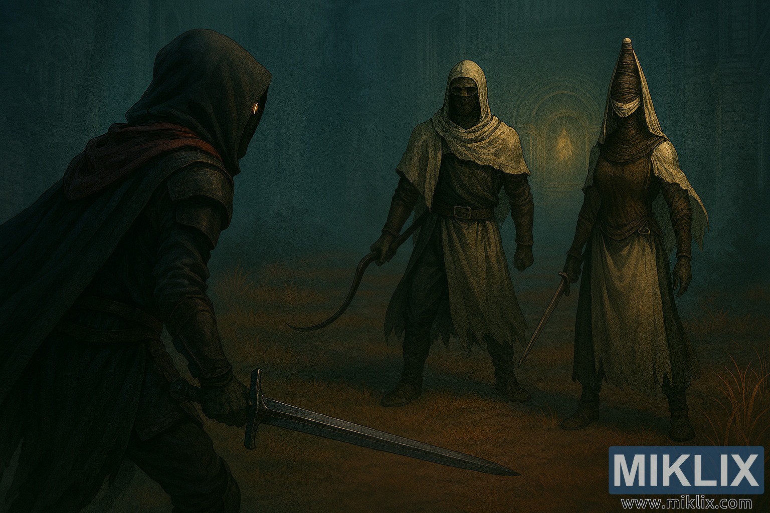 Facing him in the middle ground are the Nox Swordstress and Nox Monk, emerging from the ruins with synchronized menace. The Nox Monk, on the left, wears a pale hooded cloak over a dark tunic and leather armor. His face is obscured by a black veil, and he wields a curved, black-bladed sword in his right hand. His posture is cautious yet threatening. The Nox Swordstress, on the right, is distinguished by a tall, conical headdress that conceals her face entirely, save for a narrow slit revealing glowing red eyes. Her cream-colored cloak flows over a dark bodice and a tattered skirt. She holds a slender, straight sword at her side, her stance calm but deadly.
