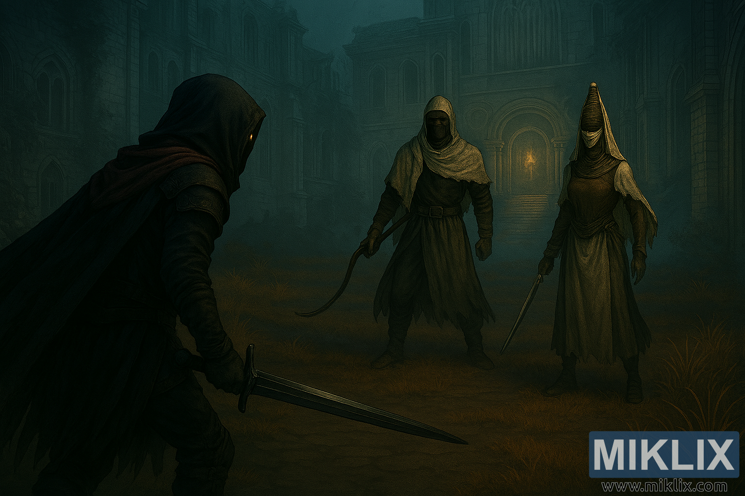 Opposite him, in the middle ground, stand the Nox Swordstress and Nox Monk. The Nox Monk, on the left, wears a pale hooded cloak over a dark tunic and leather armor. His face is hidden in shadow, and he wields a curved, black-bladed sword. His posture is cautious yet menacing. The Nox Swordstress, on the right, is distinguished by her tall, conical headdress that conceals her face except for a narrow slit revealing glowing red eyes. Her cream-colored cloak flows over a dark bodice and tattered skirt. She holds a slender, straight sword at her side, her stance calm but poised for attack.
