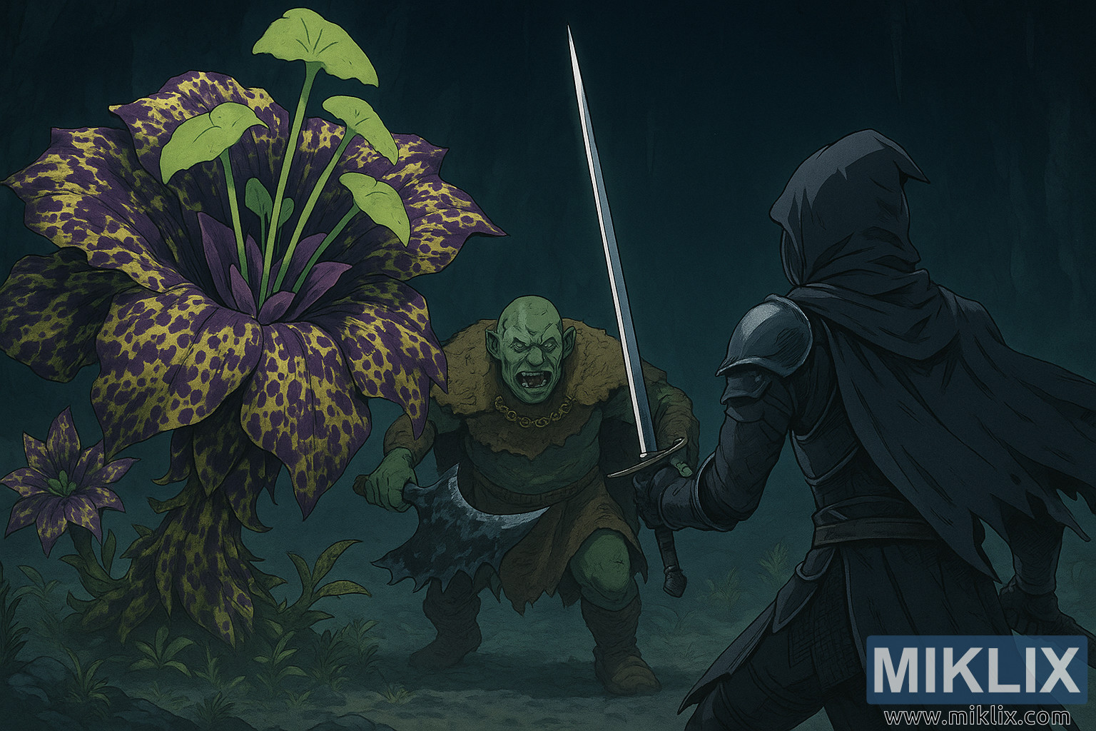 To the left looms Miranda the Blighted Bloom, an enormous carnivorous plant whose scale dwarfs both combatants. Its massive petals spread outward like a grotesque flowered maw, patterned in mottled purples and sickly yellows. From its center rise pale green stalks topped with leaf-like growths, giving the creature an unsettling, almost fungal silhouette. The plant’s organic textures are highly detailed, from the speckled petals to the thick, fibrous stem anchored to the cavern floor.