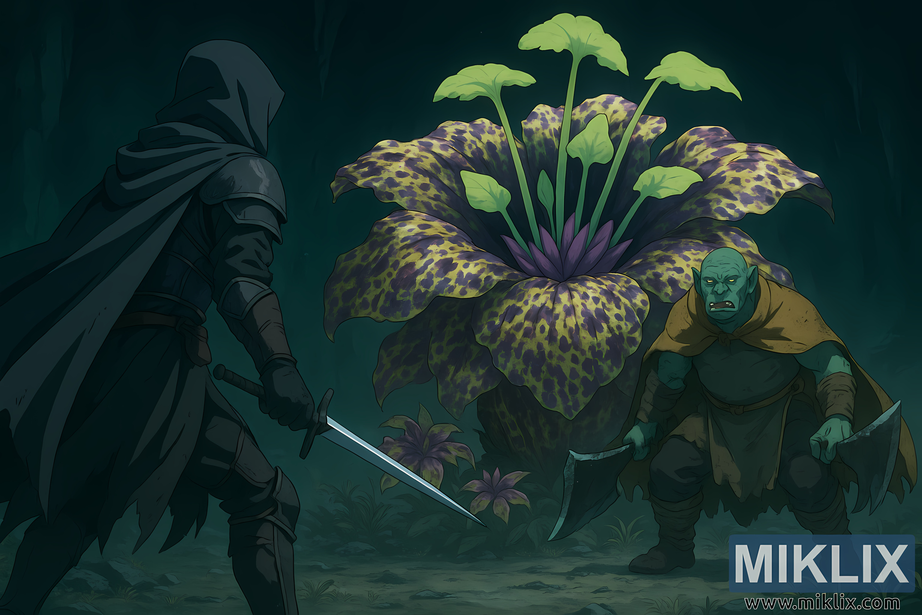 Behind and slightly to the left of the Omenkiller towers Miranda the Blighted Bloom, an enormous carnivorous plant that dominates the background. Its massive petals unfurl outward in layered rings, patterned with sickly yellow and deep purple mottling. From the center of the bloom rise pale green stalks capped with leaf-like growths, creating an eerie silhouette that feels both floral and monstrous. The textures of Miranda are richly detailed, from the speckled petals to the thick, organic stem rooted firmly in the cavern floor.