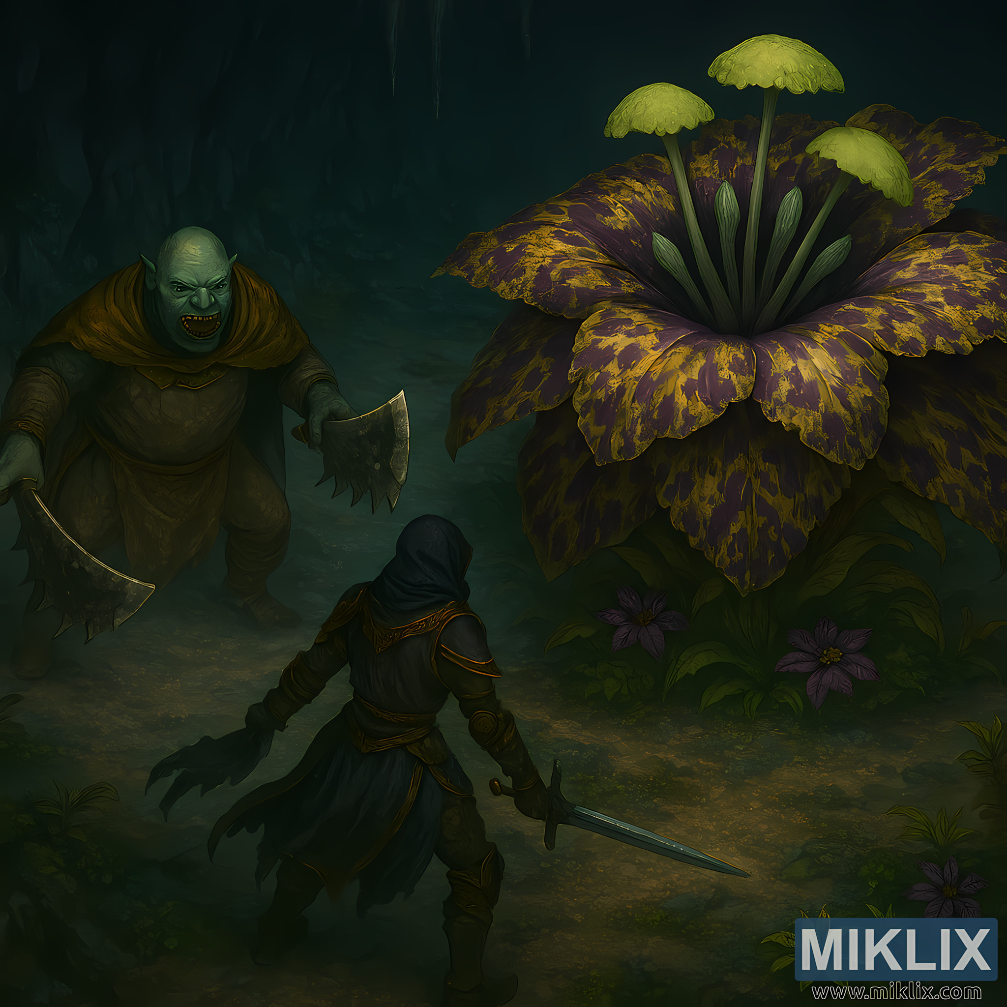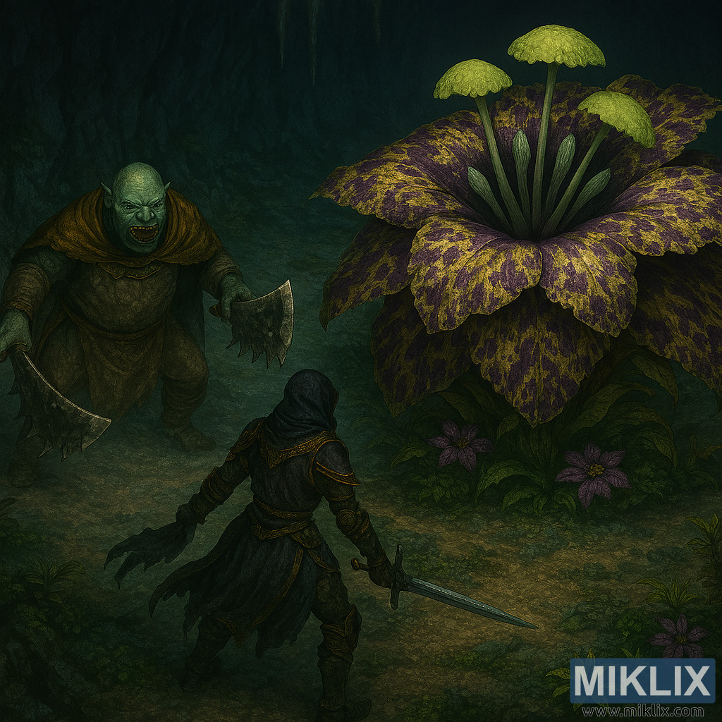 Dominating the right side of the scene is Miranda the Blighted Bloom, a towering floral monstrosity with wide, speckled petals in vibrant shades of purple, yellow, and green. Her central stalks rise upward, supporting bulbous, mushroom-like caps that emit a faint toxic glow. Smaller purple blossoms and green foliage surround her base, adding layers of botanical menace.