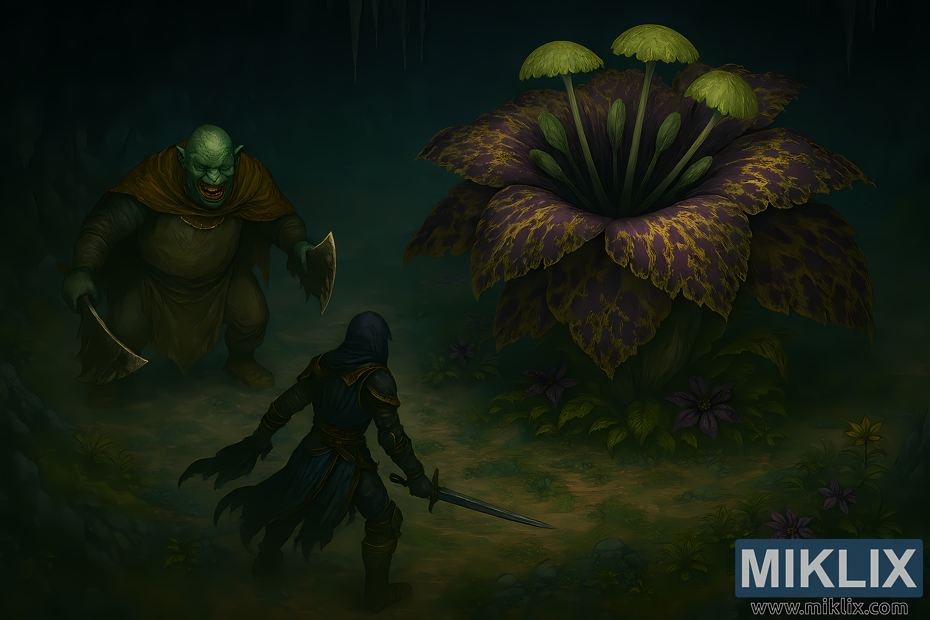 Dominating the right side of the scene is Miranda the Blighted Bloom, a towering floral monstrosity with wide, speckled petals in vibrant shades of purple, yellow, and green. Her central stalks rise upward, supporting bulbous, mushroom-like caps that emit a faint toxic glow. Smaller purple blossoms and green foliage surround her base, adding layers of botanical menace.