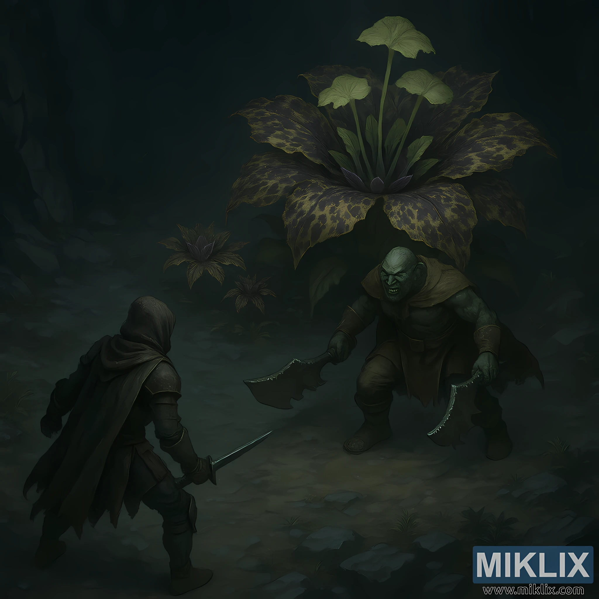 Semi-realistic Elden Ring fan art with an isometric view of the Tarnished confronting the Omenkiller and Miranda the Blighted Bloom in the shadowy depths of Perfumer’s Grotto.