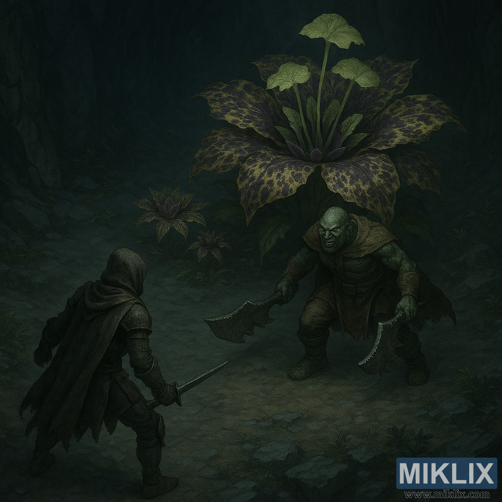 Rising behind the Omenkiller and dominating the upper-right portion of the scene is Miranda the Blighted Bloom. The enormous plant is rooted firmly into the cavern floor, its thick stem and sprawling base surrounded by smaller blighted growths. Its vast petals spread outward in layered rings, patterned with sickly yellow-green and deep, bruised purples that feel organic and unsettling. From the flower’s center extend tall, pale stalks topped with broad, leaf-like caps, creating a silhouette that is both botanical and monstrous. The textures of Miranda are rendered with painterly realism, highlighting veins, speckling, and subtle color variation.