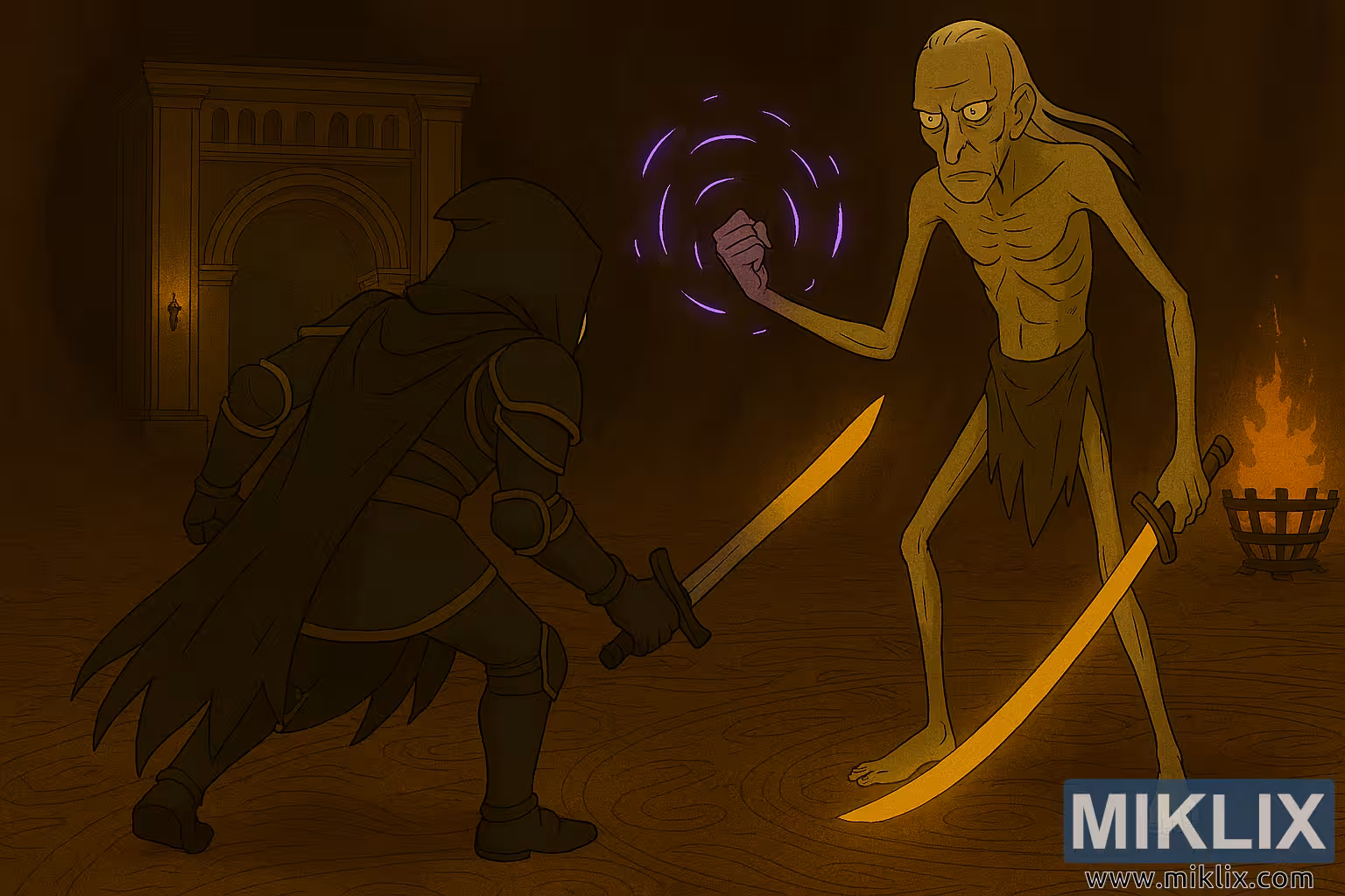 On the right, the Onyx Lord towers over the Tarnished with an emaciated, skeletal frame. His elongated limbs and gaunt torso stretch unnaturally, emphasizing his otherworldly stature. His skin is a pale yellow-green, tightly drawn over sinew and bone. His face is sunken and stern, with glowing white eyes and long, stringy white hair cascading down his back. He wears only a tattered loincloth, and his bare feet grip the stone floor. In his right hand, he firmly grips a glowing, curved sword that radiates golden light. His left hand is raised, conjuring a swirling vortex of purple gravitational energy, which distorts the air around it and pulls at nearby debris.