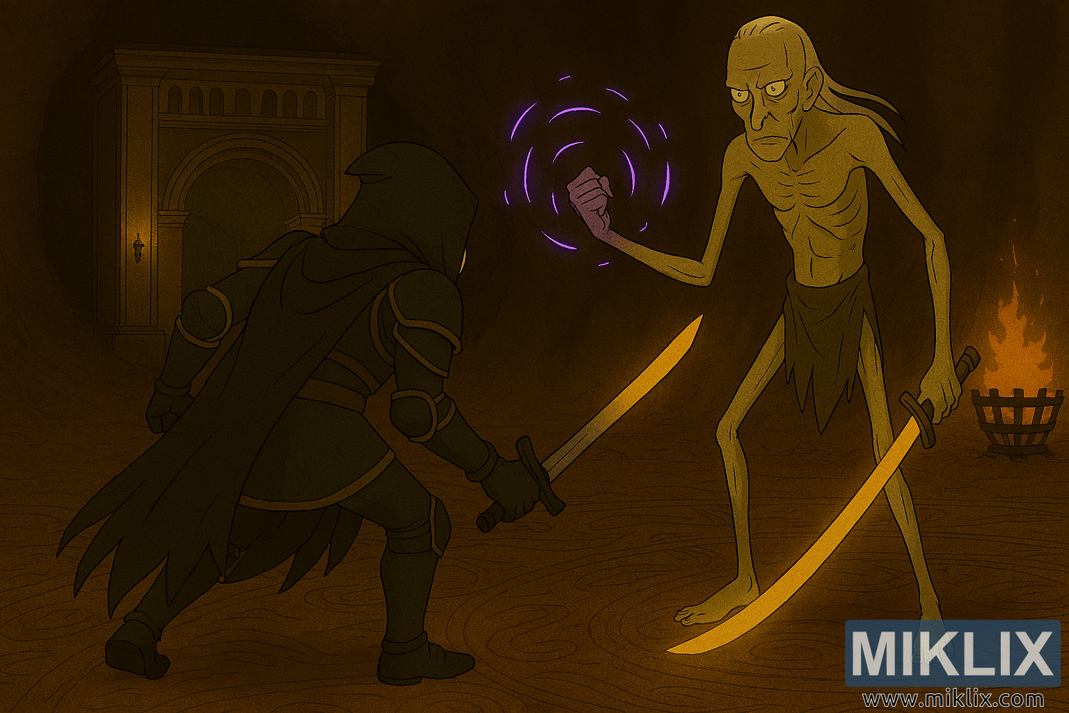 The illustration’s color palette blends earthy browns and grays with vibrant magical tones—gold from the sword, purple from the spell, and green from the doorway. Bold linework and shading techniques typical of anime art enhance the depth and texture of the characters and environment. The composition is balanced and dynamic, with the diagonal tension between the Tarnished’s leap and the Onyx Lord’s defensive stance guiding the viewer’s eye.