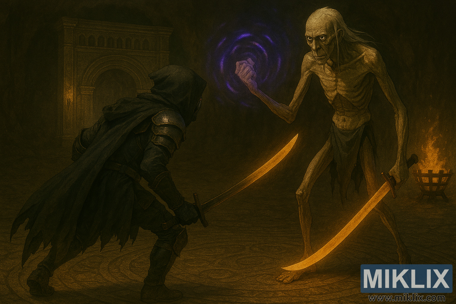 Opposite him stands the Onyx Lord, a towering, skeletal figure whose elongated limbs and emaciated frame dominate the composition. His skin is pale yellow-green, stretched tightly over bone and sinew, with ribs and joints sharply defined. His face is gaunt, with sunken cheeks, a furrowed brow, and glowing white eyes that radiate menace. Long, stringy white hair cascades down his back. He wears only a tattered loincloth, leaving his bony torso and legs exposed. In his right hand, he grips a glowing curved sword, its golden light casting eerie reflections on his skin. His left hand is raised, conjuring a swirling vortex of purple gravitational energy, which distorts the air and casts a spectral glow.