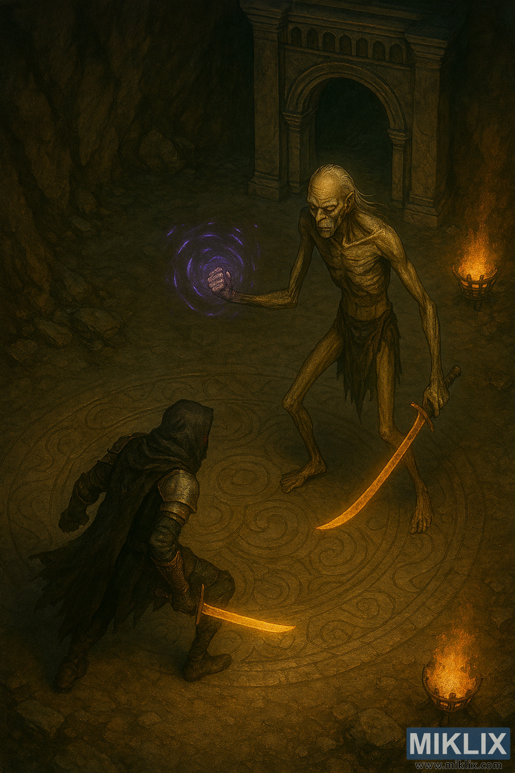 Towering over him in the upper right quadrant is the Onyx Lord, rendered with exaggerated height and skeletal proportions. His pale yellow-green skin clings tightly to bone and sinew, revealing every rib and joint. His limbs are elongated and angular, and his face is gaunt, with sunken cheeks, glowing white eyes, and a furrowed brow. Long, stringy white hair cascades down his back. He wears only a tattered loincloth, leaving his emaciated torso and legs exposed. In his right hand, he grips a glowing curved sword that emits a golden light. His left hand is raised, conjuring a swirling vortex of purple gravitational energy, which distorts the air and casts a spectral glow across the chamber.