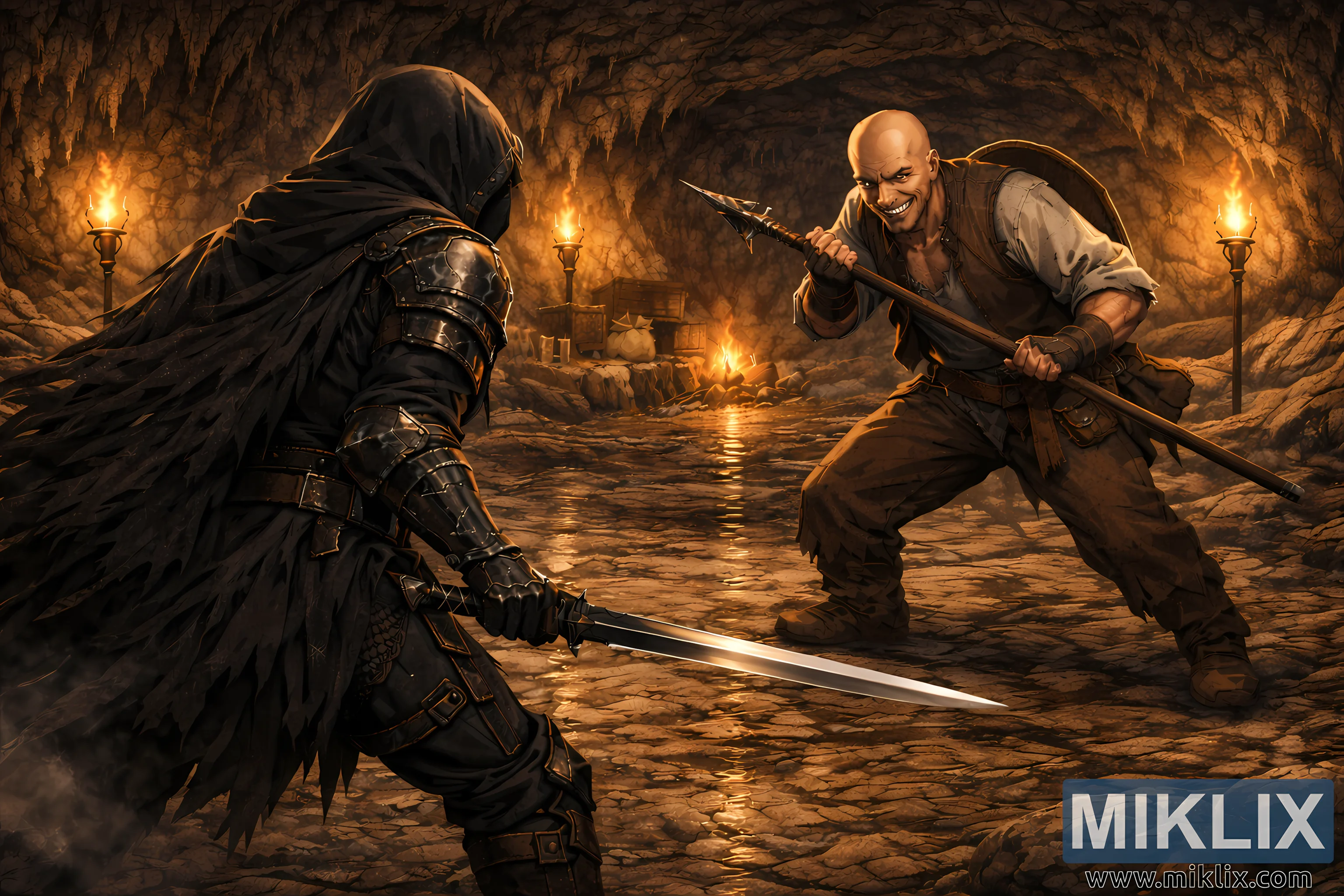 A semi-realistic fantasy digital painting captures a tense pre-combat confrontation inside a vast underground cavern illuminated by warm torchlight and a distant campfire. The composition adopts a cinematic, slightly pulled-back perspective that reveals a wide stretch of the cave interior while keeping the two central figures sharply defined in the foreground. The cavern ceiling arches overhead in layered stone ridges lined with irregular stalactites, their rough mineral surfaces highlighted by flickering orange flames mounted in iron wall sconces. Shadows pool between protruding rock formations, creating dramatic contrast and depth. The ground is uneven and damp, scattered with shallow reflective puddles that mirror the glow of the torches and the silhouettes of the characters. A thin veil of mist or dust hangs low in the air, softening distant edges and adding a humid, subterranean atmosphere that enhances the realism of the scene.