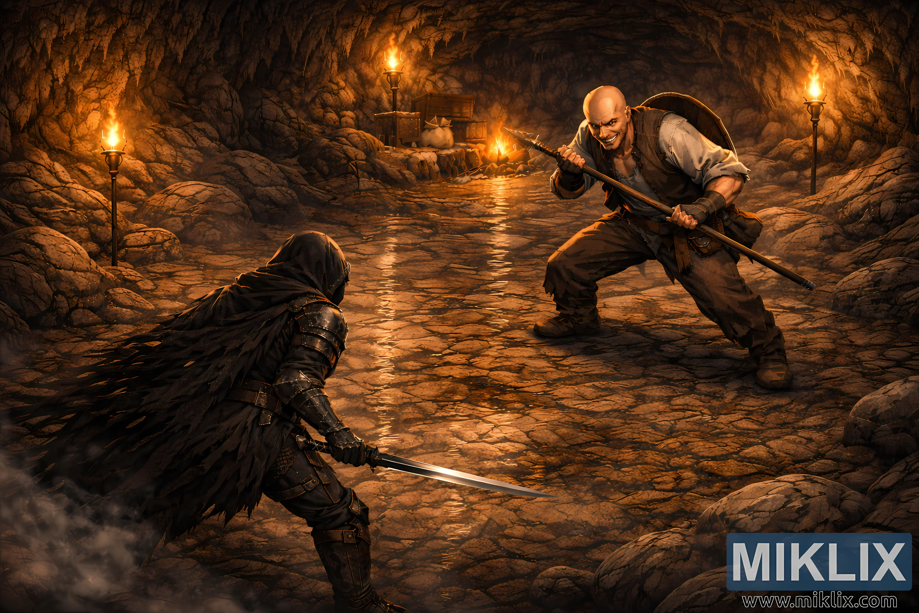 The elevated, pulled-back framing reveals environmental storytelling behind him. A small campfire burns near stacked crates, burlap sacks, and modest treasure chests, its glow reflecting in puddles and illuminating the surrounding rock with gradients of amber and gold. The color palette balances cool charcoal grays and deep blues in the shadows with rich oranges and warm browns from the torchlight, producing a cinematic contrast that heightens tension. The image captures the precise instant before violence erupts—no blades collide and no sparks fly—only the heavy silence of two wary opponents measuring distance in a cavern filled with echoes, firelight, and the promise of imminent battle.