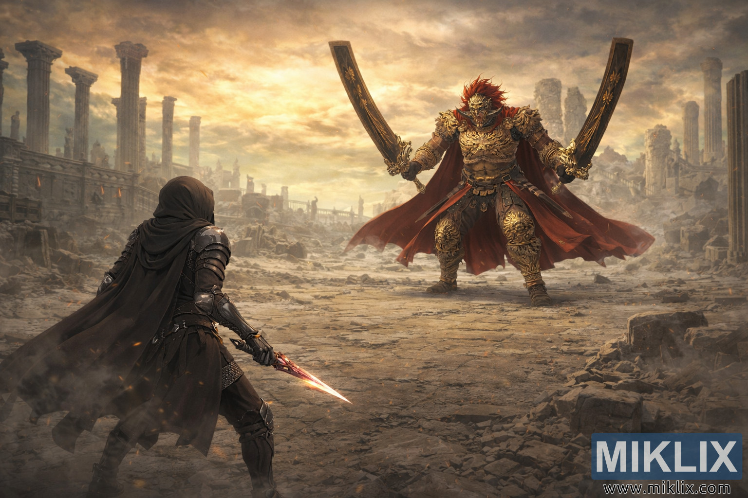 The environment plays a major role in the scene’s atmosphere. The battlefield is strewn with rubble, fractured stone, and uneven terrain, stretching far into the distance. Tall, broken columns rise from the ruins on both sides, remnants of a once-majestic city now reduced to decay. In the far background, additional crumbling structures and pillars fade into haze, reinforcing the vastness of Enir-Ilim. The sky above is filled with warm, dusty gold and amber tones, as if lit by a low, eternal sun filtered through ash and smoke. Fine particles and embers drift through the air, enhancing the sense of stillness before chaos.