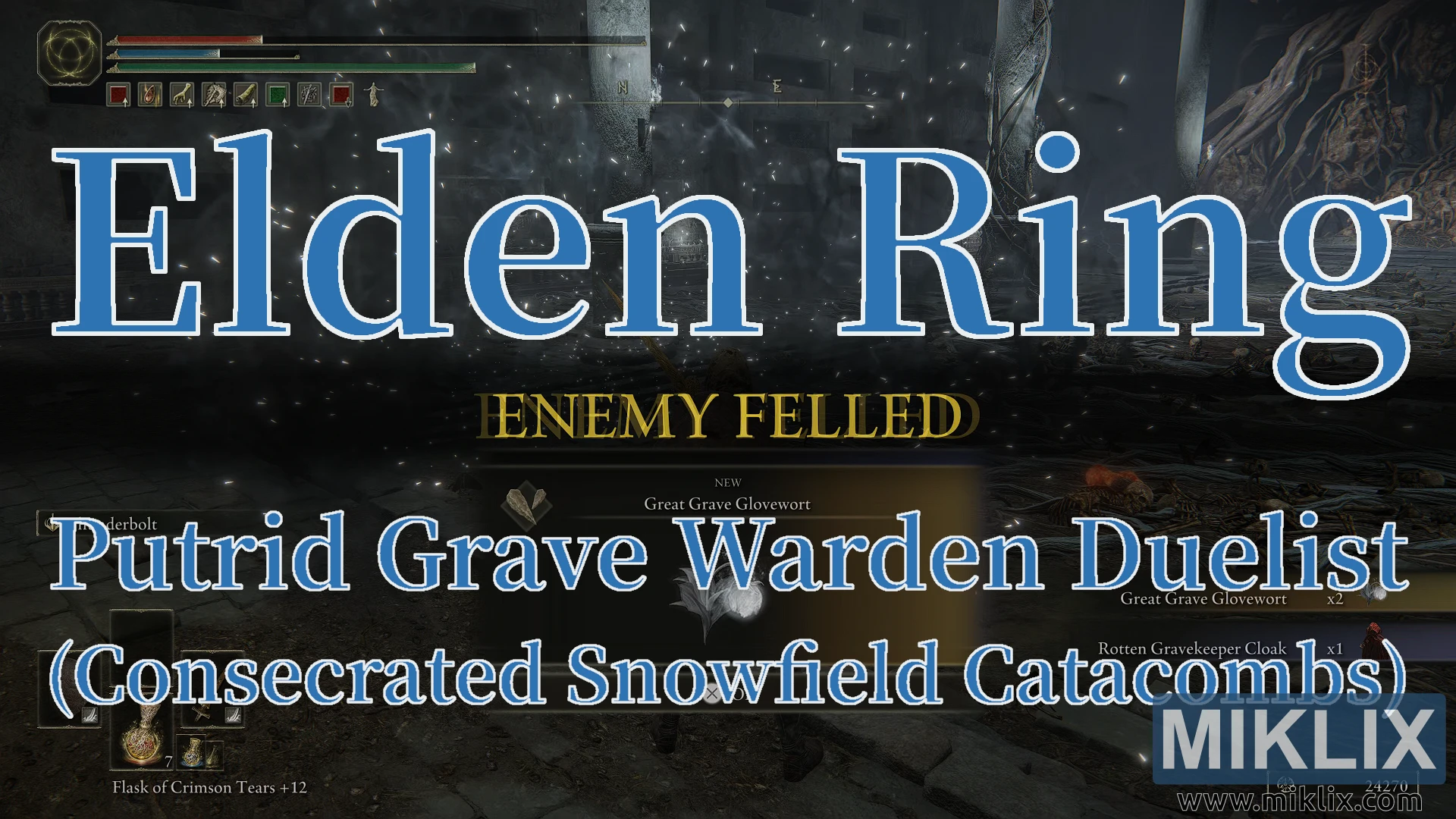 Putrid Grave Warden Duelist is in the lowest tier of bosses in Elden Ring, Field Bosses, and is the end boss of the Consecrated Snowfield Catacombs dungeon in the Eastern part of the Consecrated Snowfield. Like most lesser bosses in the game, defeating this one is optional in the sense that it is not required in order to progress the main story.