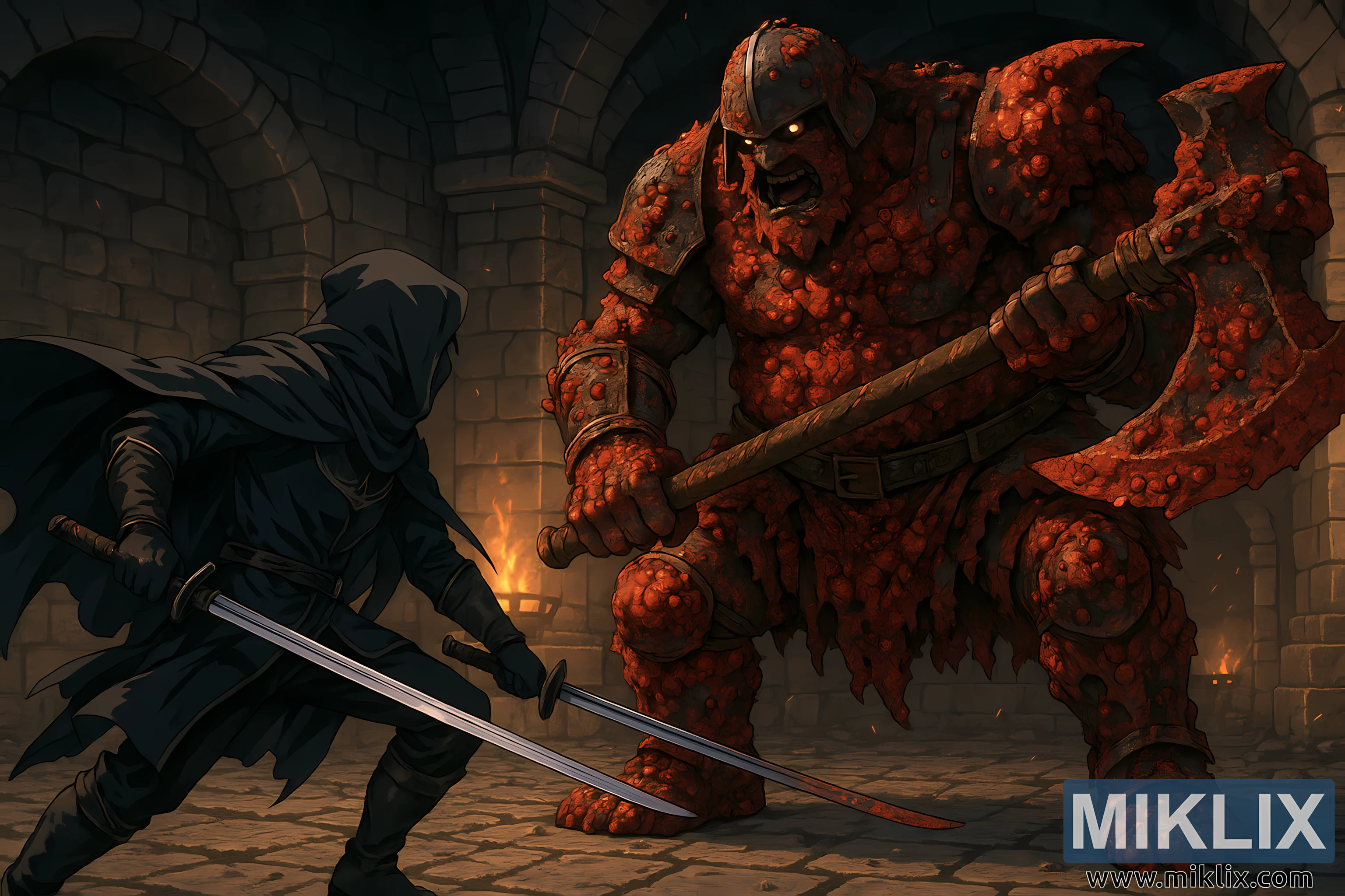 The Duelist wields an enormous two-handed axe. Its blade is chipped and jagged, embedded with the same grotesque rot that covers his body. The weapon is held mid-motion, raised diagonally as though preparing to swing downward with crushing force. The perspective and foreshortening amplify the sense of impending impact. Chains dangle from parts of his armor, subtly swaying, reinforcing the feeling of mass and momentum.