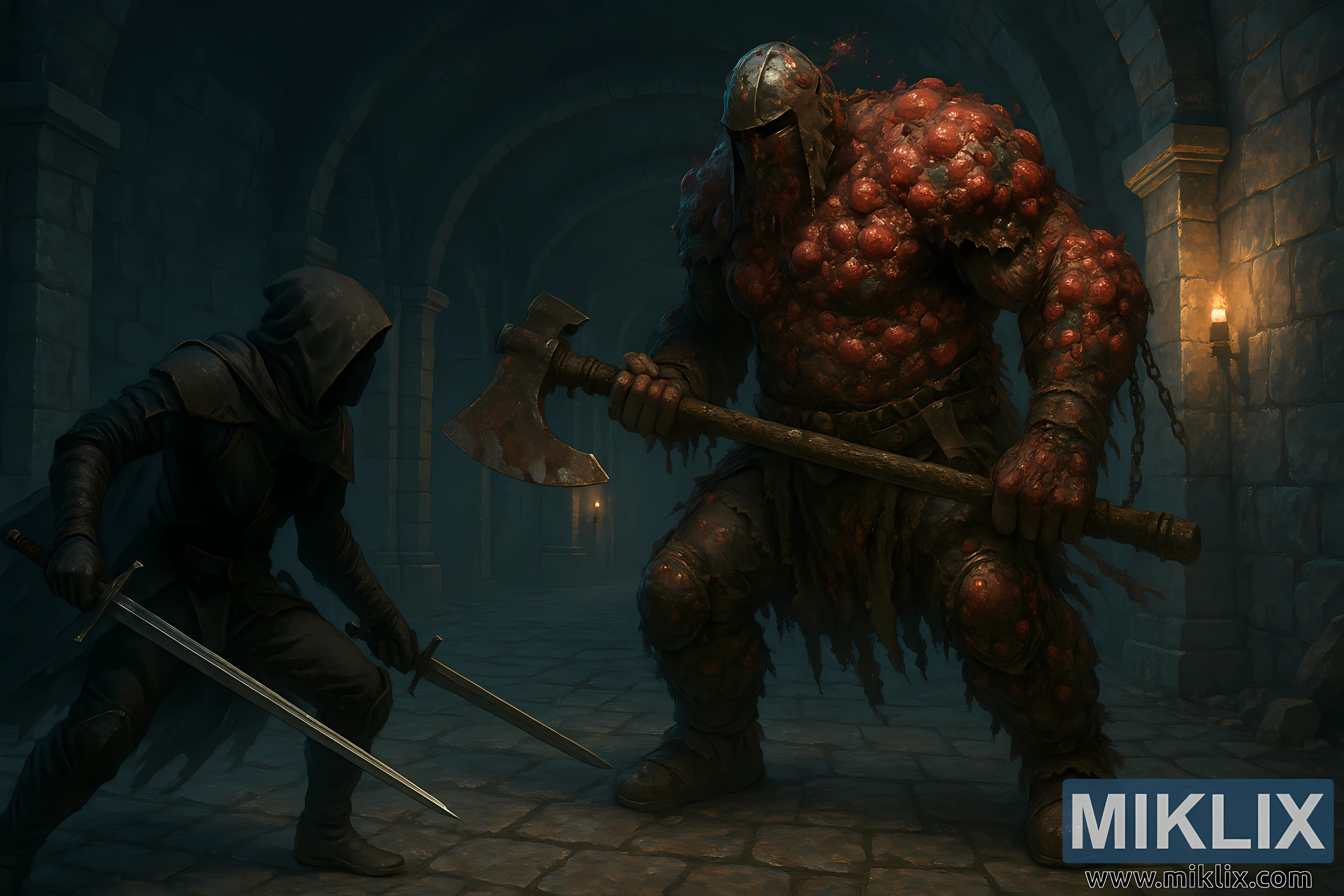 Soft particles of dust drift through the dim air, catching the warm torch glow. Shadows fall long across the floor, grounding both figures firmly in the environment. The interplay of light, texture, and atmospheric depth lends the entire composition a cinematic realism, transforming the moment into a tense standoff frozen in time. The viewer can almost feel the cold air of the catacombs, the weight of stone overhead, and the deadly silence before steel and rot collide.