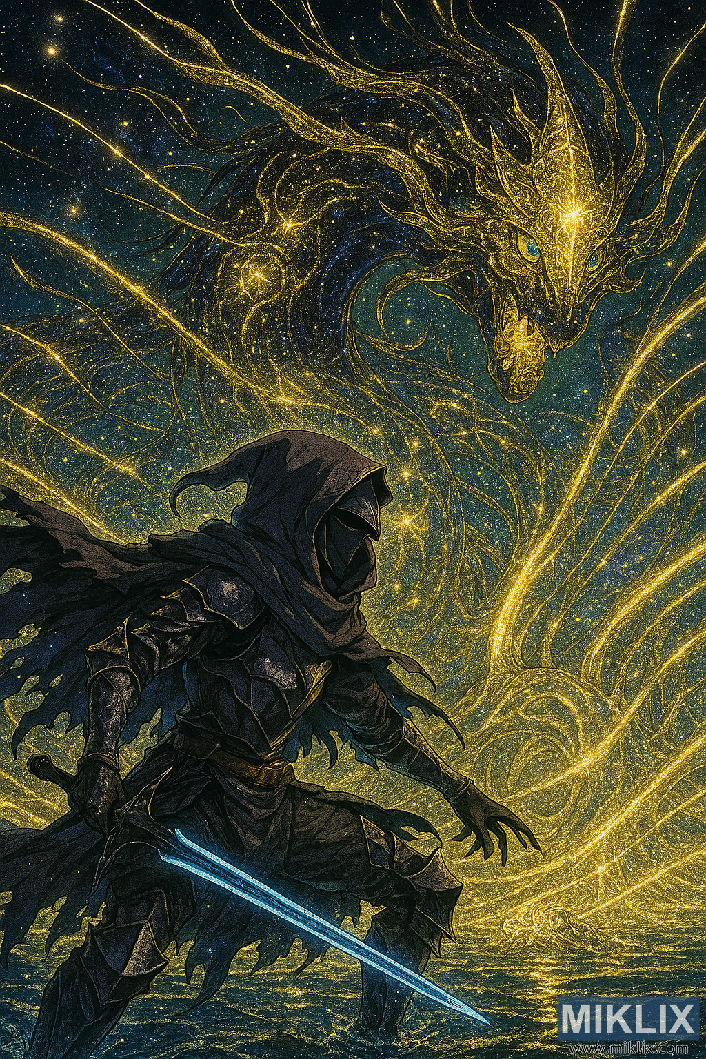 The ground beneath them is a shallow reflective pool, rippling with the energy of the confrontation. Reflections of the stars and golden light dance across the water’s surface, adding depth and motion to the scene. The lighting is dramatic, with strong contrasts between the dark armor and the radiant cosmic glow.