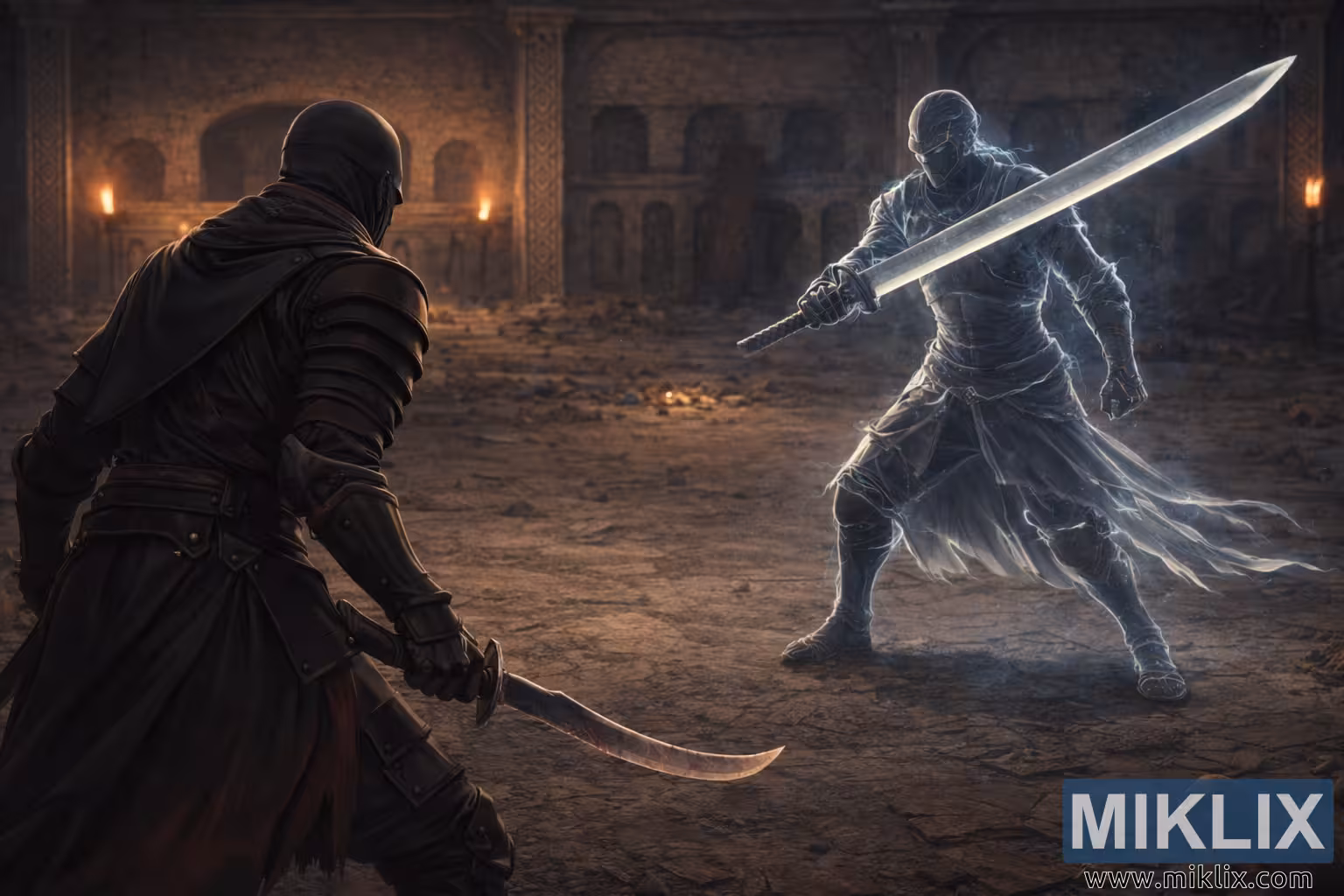 The contrast between warm torchlight around the Tarnished and the cold spectral glow of the knight visually divides the scene into opposing forces. The pulled-back perspective reveals more of the mausoleum around the Tarnished, emphasizing isolation and scale, while the knight’s closer position tightens the tension. The image captures the psychological weight of the moment before combat begins, where silence, resolve, and impending violence converge.