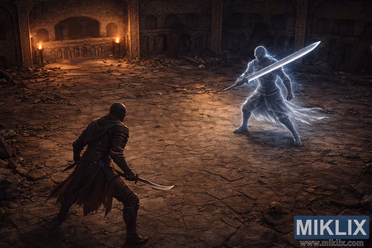 Across the stone floor, occupying the upper-right area of the composition and noticeably closer than earlier iterations, stands the ghostly bluish knight. From the isometric view, the knight’s semi-transparent form is clearly defined against the darker stone beneath. Its armor follows the shape of a disciplined warrior’s gear, with layered plates and flowing cloth elements, yet it appears weightless and unreal, as though formed from condensed mist and memory. A cold, pale blue aura outlines the knight’s body, spilling softly onto the surrounding floor. Wisps of spectral energy trail from its limbs and armor, drifting outward and dissolving slowly, enhancing the eerie stillness of the moment.
