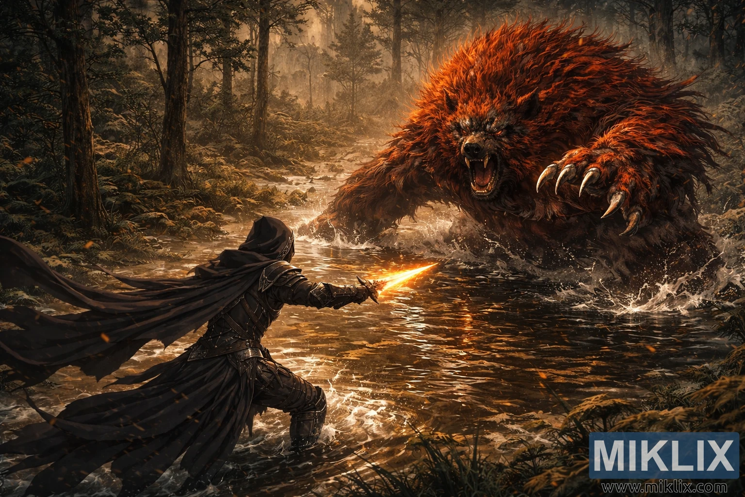 Ralva, the Great Red Bear, dominates the upper right of the frame, a mountainous mass of crimson fur erupting from the trees. The creature is captured mid-lunge, its hulking body angled diagonally toward the Tarnished, mouth wide in a feral roar. From above, the layered textures of its mane are especially vivid, radiating outward in fiery tufts that glow under shafts of amber light filtering through the canopy. One massive paw crashes into the water, while the other is raised, claws splayed and gleaming, casting jagged reflections across the stream below.
