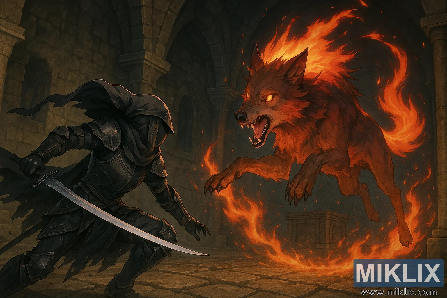 Opposite them, the Red Wolf leaps forward mid-pounce, its form suspended in an arc of predatory aggression. Flames writhe from its mane and tail in vivid tendrils, bathing its fur in bright, molten hues of orange and scarlet. Its eyes burn with an intense, supernatural glow, and its snarl—teeth bared, jaws wide—exudes both ferocity and intelligence. The arcs of flame trailing behind its movement curl across the ground like living ribbons, momentarily illuminating carvings and alcoves in the ancient stone.