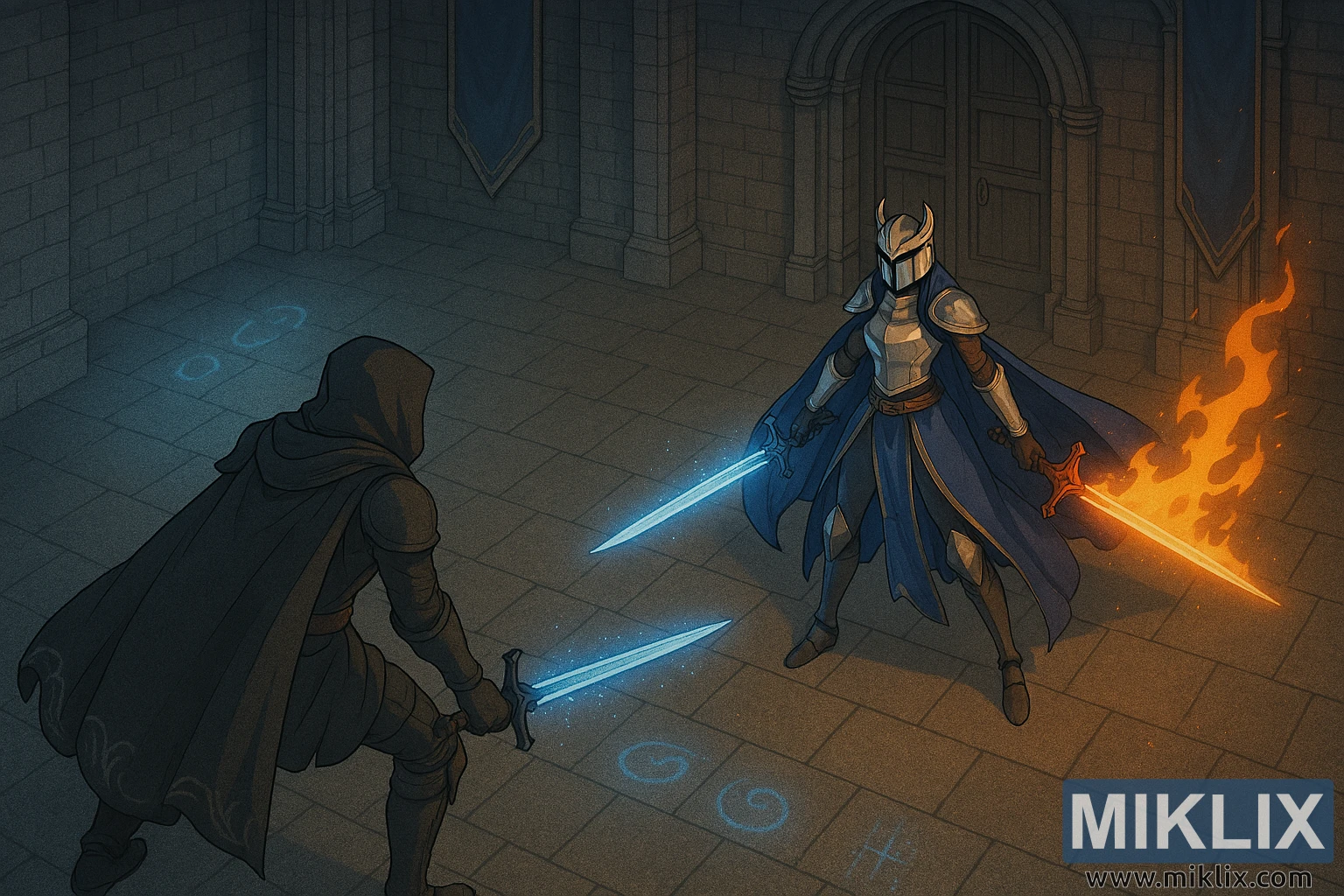 The composition is balanced and dynamic, with the elemental swords forming intersecting diagonals that draw the viewer’s eye to the center of the confrontation. The wide perspective allows for a fuller appreciation of the environment, emphasizing the scale and tension of the duel. The semi-realistic rendering enhances the emotional intensity through detailed textures, realistic lighting, and expressive poses, making this a visually compelling tribute to Elden Ring’s lore and aesthetic.