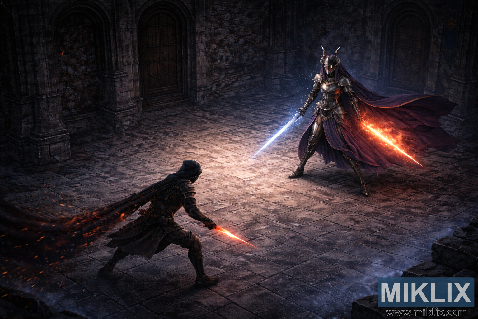 The lighting of the hall is dominated by cool blues and steel-gray shadows, making the fire and frost stand out in stark contrast. The stone tiles between the fighters glow faintly where the colors meet, turning the center of the chamber into a crucible of clashing energies. The realistic textures, restrained color palette, and grounded proportions all contribute to a somber, immersive atmosphere, capturing the moment just before steel meets steel in a brutal confrontation.