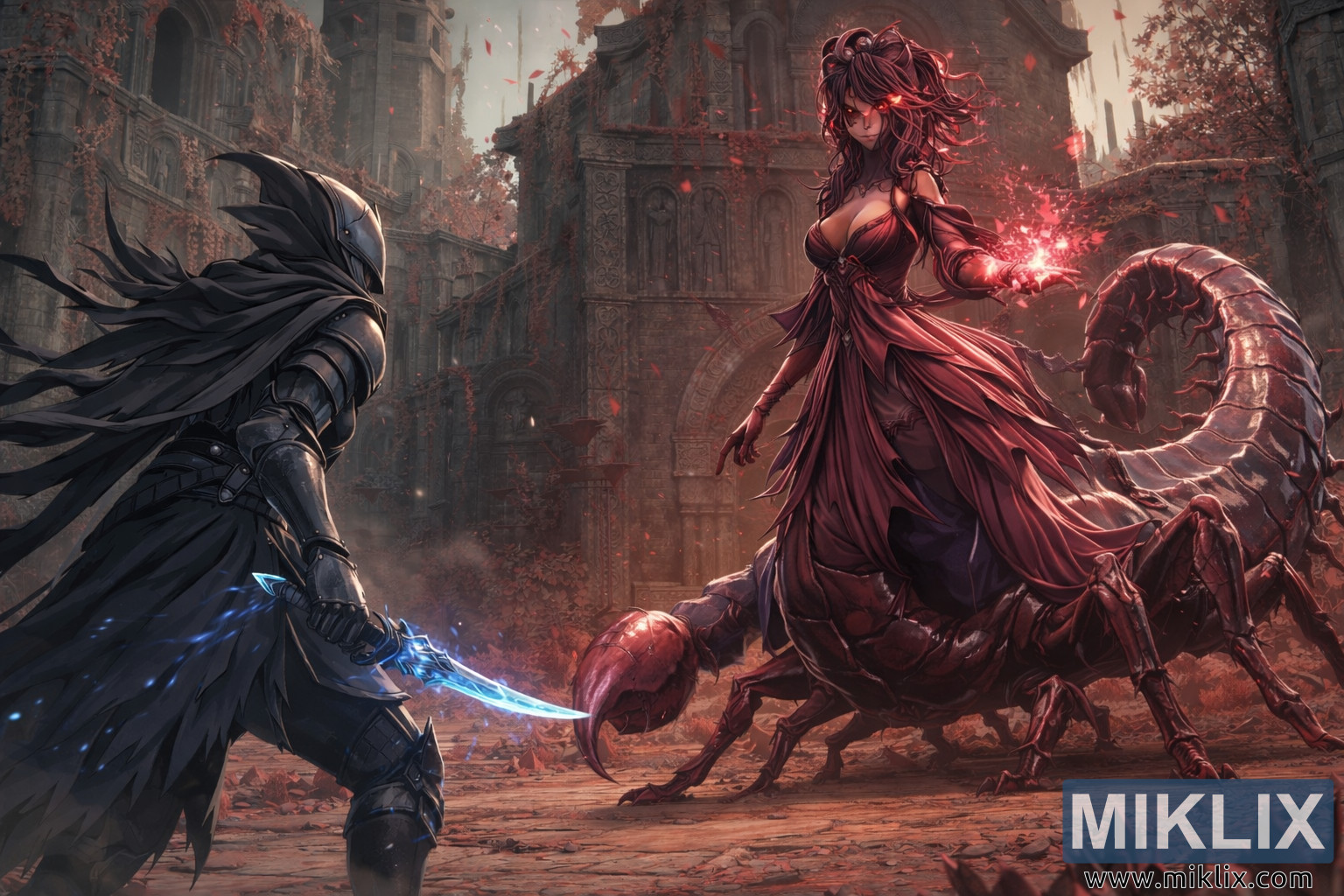 Dominating the right side of the composition is Romina, Saint of the Bud, now depicted on a much larger scale to emphasize her role as a boss and overwhelming threat. Her form is imposing and monstrous: a graceful humanoid upper body seamlessly fused to a massive, scorpion-like lower body. The segmented crimson carapace of her lower half spreads across the ground, her many legs braced and coiled with latent power. Her long, curved tail arches behind her, ending in a thick, venomous stinger that looms like a promise of imminent violence.