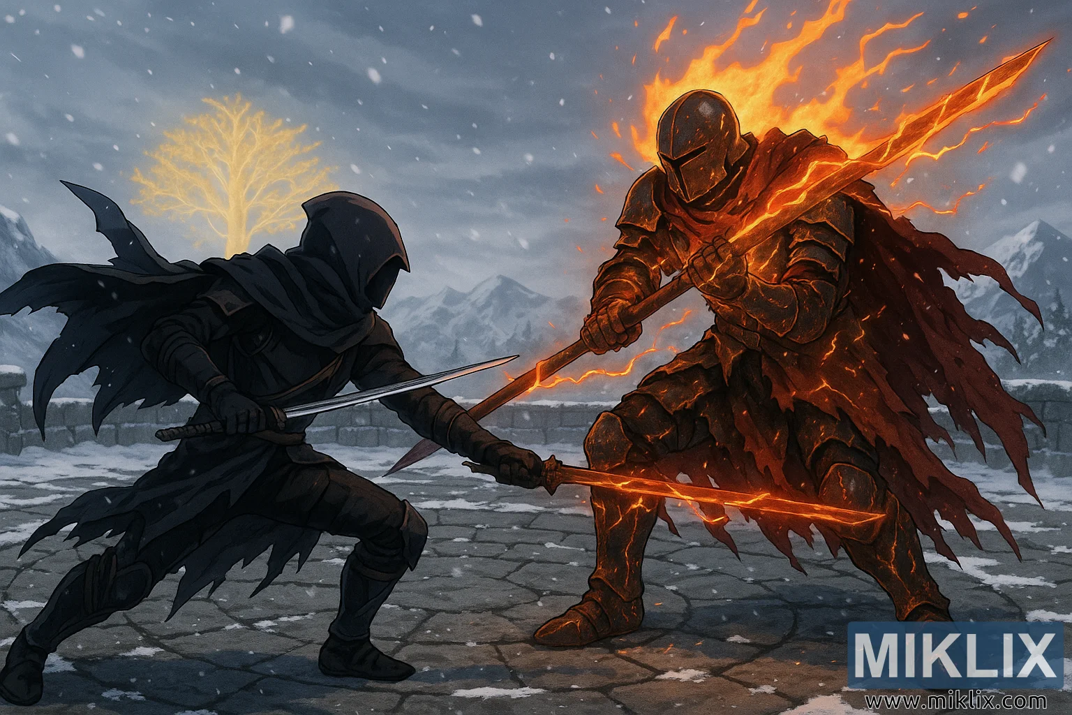 Anime-style battle scene of a Black Knife warrior fighting Roundtable Knight Vyke, who wields his flaming spear with both hands amid the snowy Lord Contender’s Evergaol.