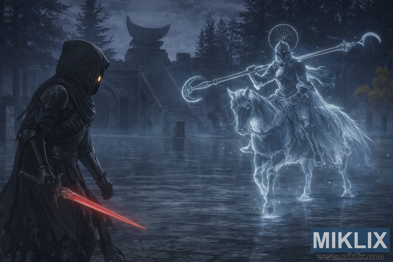 Opposite them, Royal Knight Loretta emerges from the fog like a vision from a forgotten age. Her translucent form glows with ethereal light, illuminating the spectral horse she rides and the ornate polearm she brandishes. Her armor, regal and otherworldly, shimmers with ghostly hues of silver and blue, adorned with filigree that evokes the grandeur of the Carian royal lineage. Loretta’s expression is unreadable, her presence both majestic and mournful, as if bound by duty to defend the ruins of her fallen house.