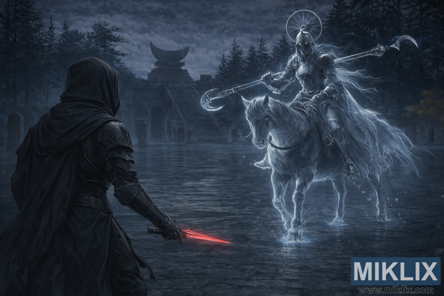 Opposite them, astride a ghostly steed, looms Royal Knight Loretta. Her armor gleams with ethereal silver-blue tones, and her ornate polearm is raised in a poised, defensive arc. A radiant halo-like sigil floats above her head, signifying her spectral nature and her mastery of glintstone sorcery. Loretta’s expression is unreadable, her form both regal and otherworldly, as if she were a guardian bound by duty to protect the secrets of the manor.