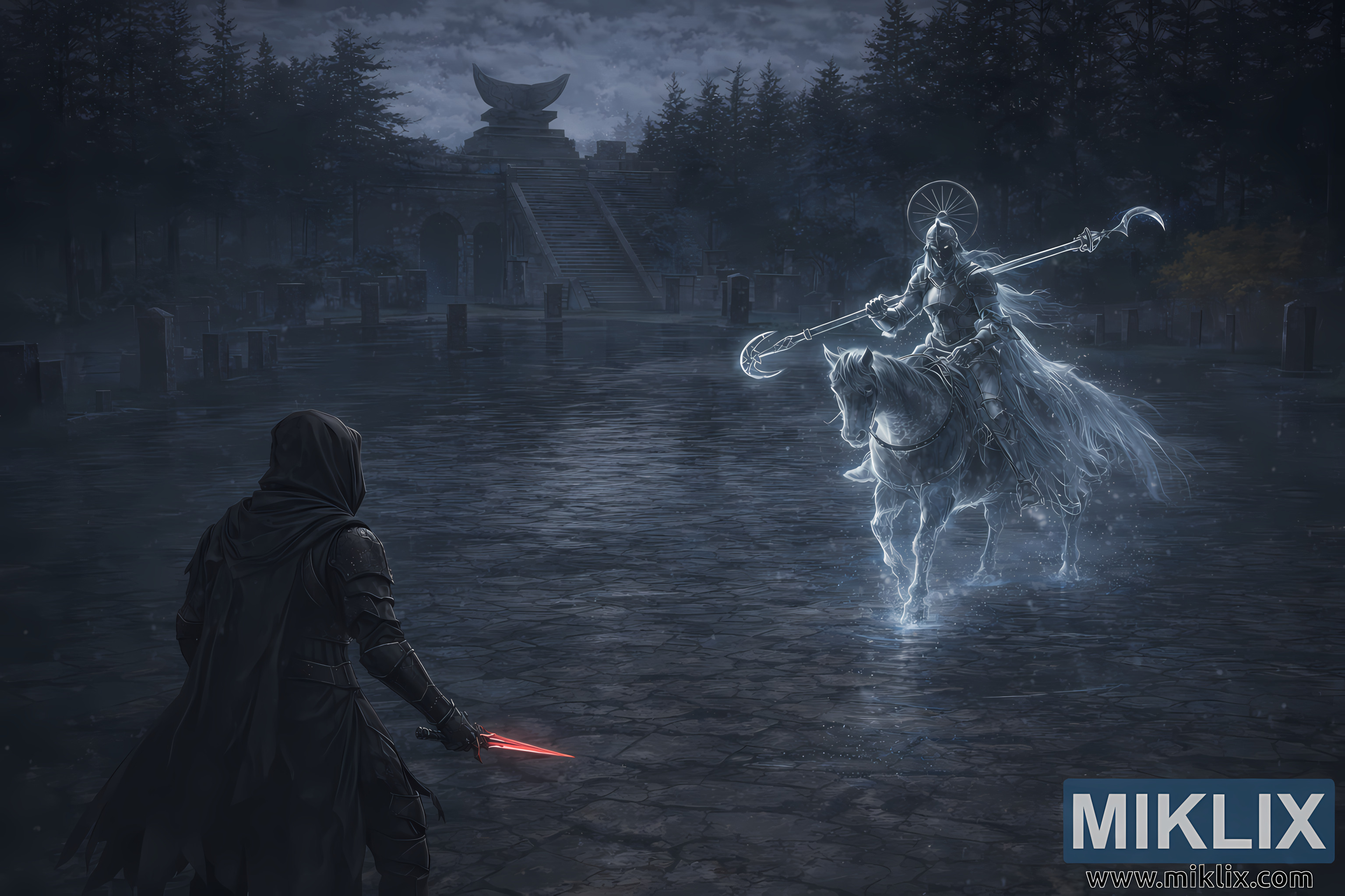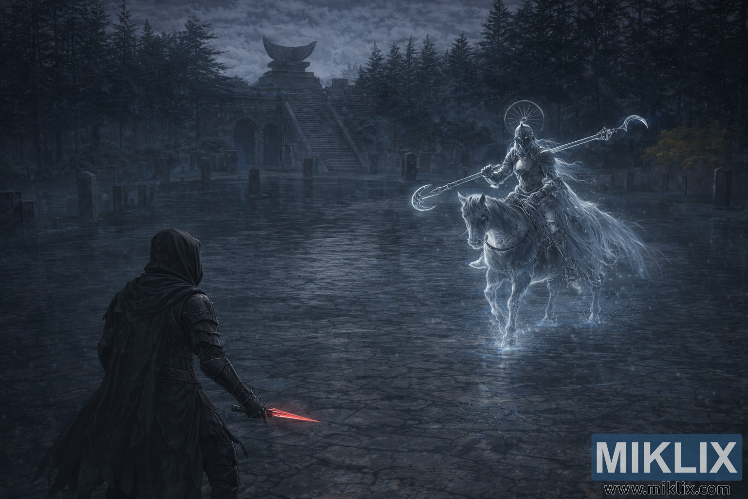 This image pays homage to one of Elden Ring’s most memorable encounters, blending narrative weight with artistic finesse. The watermark "MIKLIX" and the website "www.miklix.com" in the bottom right corner identify the creator, whose attention to detail and mastery of mood bring this fan art to life. Whether viewed as a tribute to the game’s lore or a standalone piece of fantasy art, the image evokes the eerie beauty and high-stakes drama that define the Lands Between.