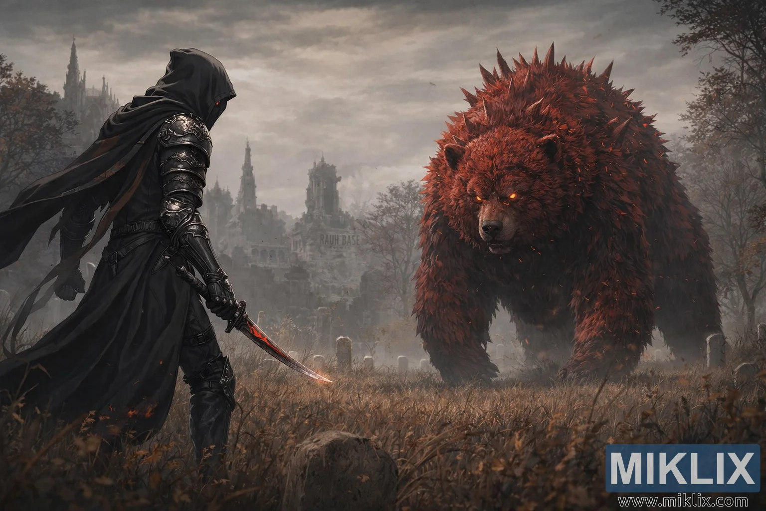 Despite the dramatic scale, the image’s true power lies in its quiet. No clash has yet occurred. There is only the tension of two predators measuring one another, the Tarnished’s calm restraint against the bear’s simmering fury. The composition freezes the exact instant before fate tilts toward bloodshed, inviting the viewer to linger inside the silence and feel the weight of the moment before the world explodes into motion.