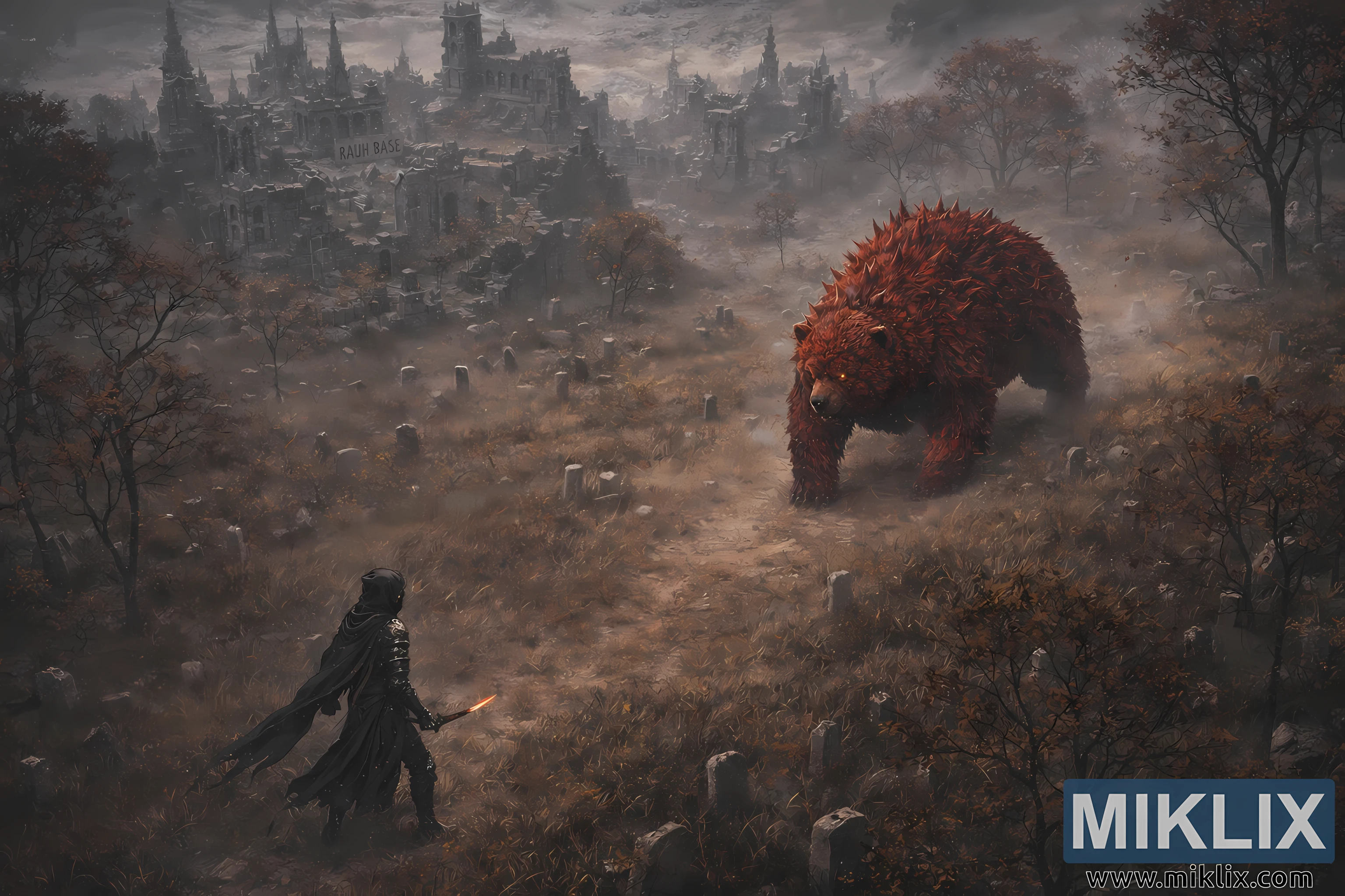 The environment frames their confrontation with oppressive grandeur. The field is peppered with hundreds of crooked gravemarkers, some leaning at impossible angles, others swallowed halfway by the tall, dry grass. Thin, skeletal trees rise here and there, their rust-colored leaves echoing the palette of Rugalea’s fur and tying the entire landscape together in shades of brown, gray, and blood-red. In the far background, the broken city of Rauh Base stretches across the horizon: shattered gothic towers, collapsed bridges, and cathedral spires emerge through heavy fog, their silhouettes layered in pale grays like fading memories of a lost civilization.