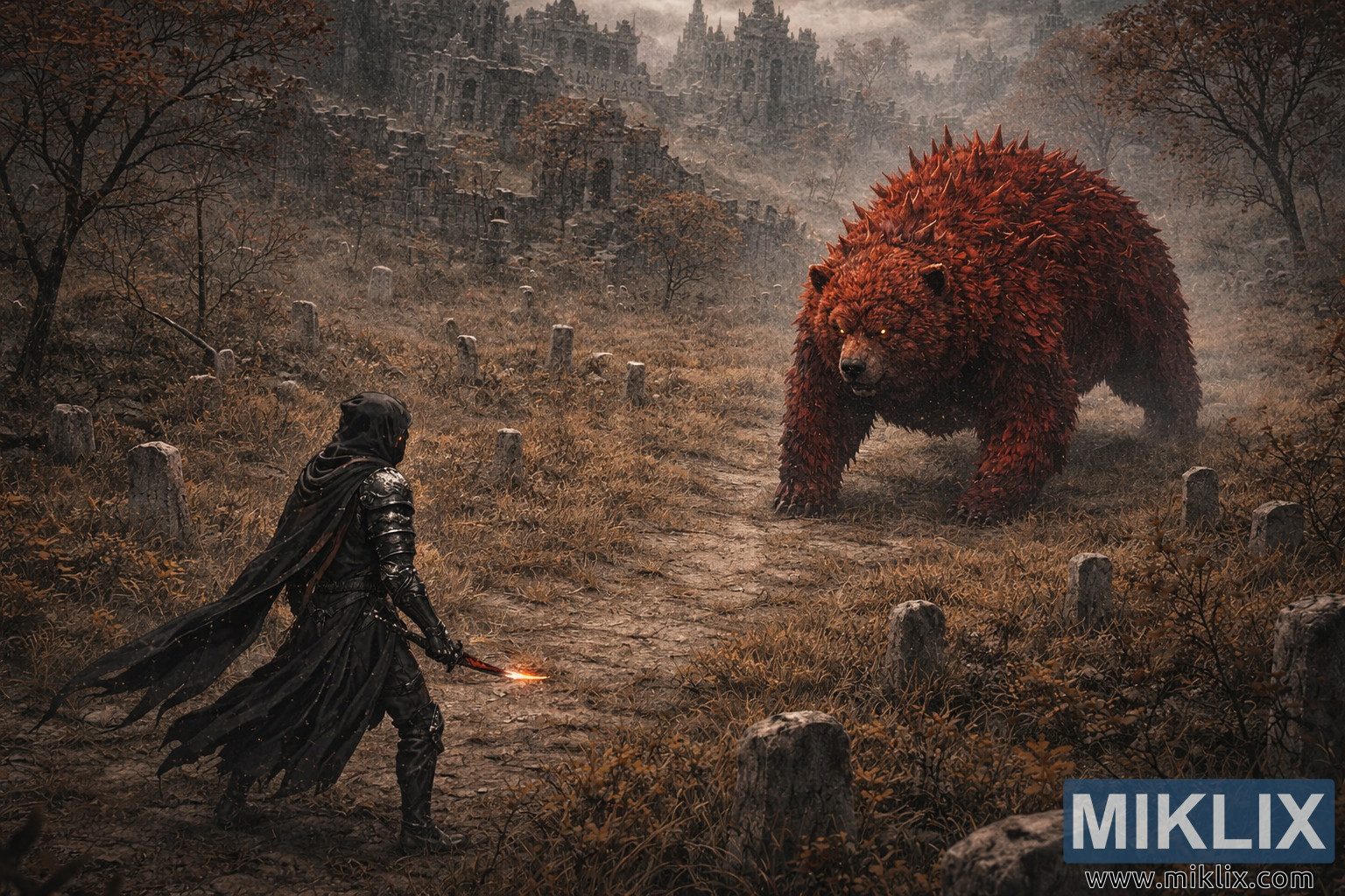 The ground between them is a scarred corridor of trampled weeds and brittle grass, flanked by crooked gravestones that lean at odd angles like broken teeth. This accidental lane of approach draws the viewer’s eye from the Tarnished straight to the bear, turning the space into a natural dueling ground. Beyond, the Rauh Base ruins loom in fractured layers: towering gothic walls, collapsed arches, and jagged spires dissolve into heavy fog, their silhouettes stacked in desaturated grays that fade with distance. Bare trees with rust-colored leaves punctuate the field, echoing the red of Rugalea’s fur and unifying the palette into somber autumn hues.