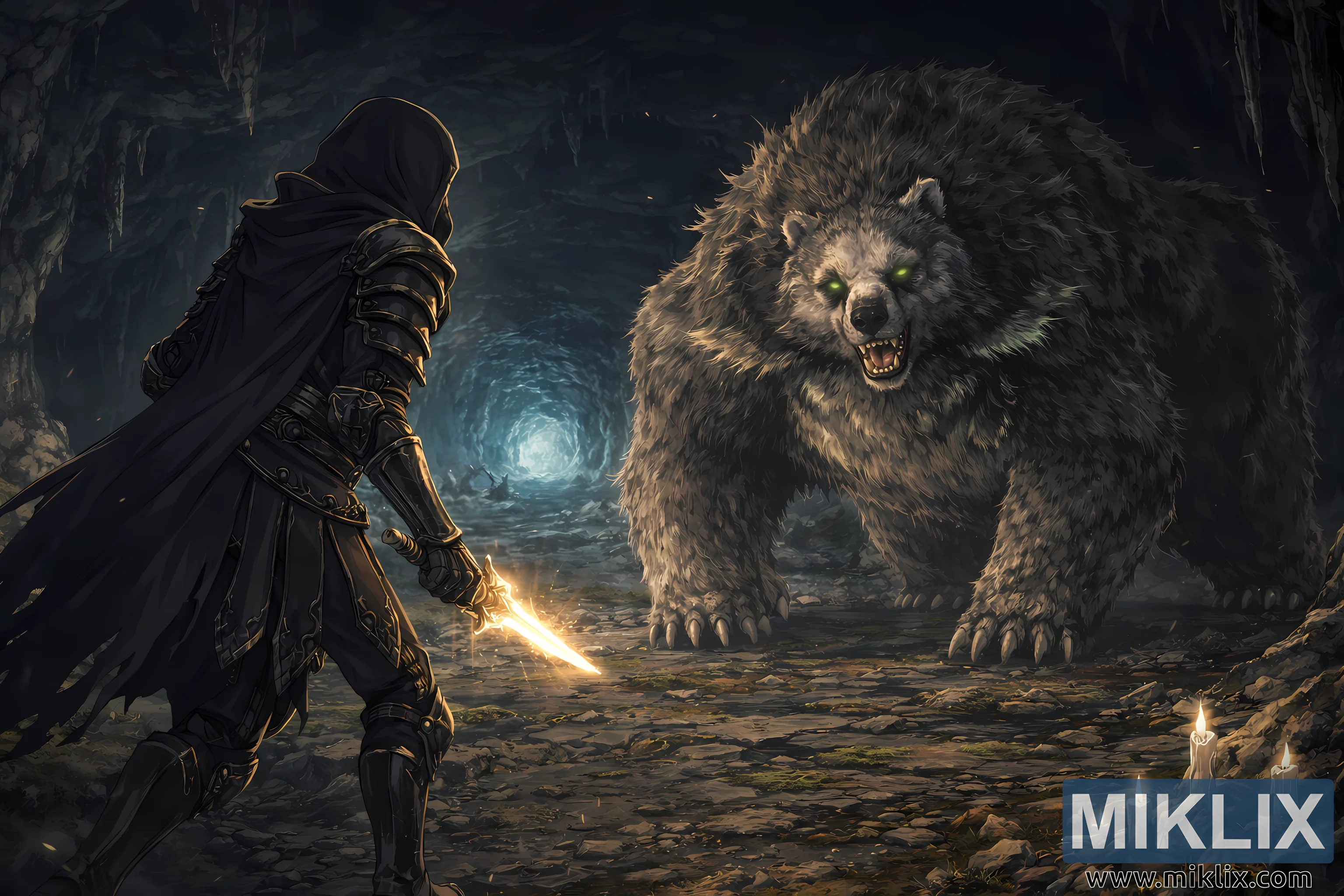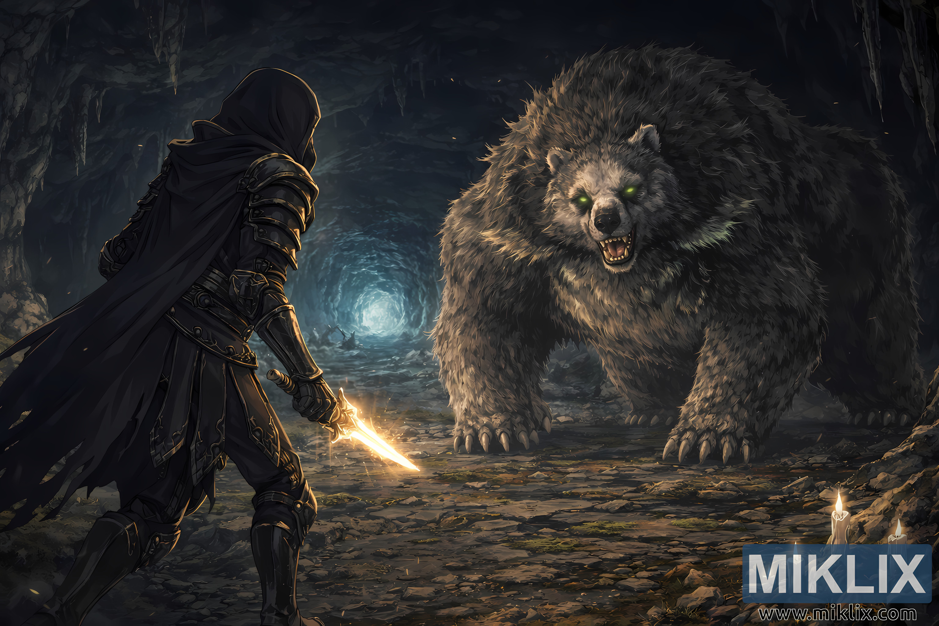 An atmospheric anime-style fantasy illustration set deep within a cavernous underground tunnel evokes a tense moment frozen just before the outbreak of battle. The scene is composed in a wide cinematic landscape orientation, drawing the viewer’s eye from the shadowed foreground toward a softly glowing opening in the distant cave wall. Jagged stalactites hang from the ceiling while uneven stone formations and scattered debris line the ground, creating a rugged and ancient environment that feels both natural and ominous. On the left side of the frame stands a lone armored warrior known as the Tarnished, clad in sleek, dark Black Knife armor that reflects faint highlights from nearby candlelight. The armor is intricately detailed with layered plates, leather straps, and subtle metallic trims, giving a sense of agility and stealth rather than brute strength. A hooded cloak drapes behind the figure, caught in a gentle motion that suggests cautious forward movement. In the warrior’s right hand glows a short ethereal dagger, its golden light casting warm reflections onto the armor and the rocky floor beneath. Opposite the warrior, occupying the right side of the composition, looms a colossal Runebear, its immense fur rendered with dense, textured brushwork that blends shades of brown, gray, and muted green. The beast’s posture is low and defensive, muscles tensed and claws spread wide against the ground as if preparing to lunge. Its luminous green eyes pierce through the darkness, contrasting sharply with the dim cave lighting and adding an otherworldly intensity to its expression. Thin streams of light from unseen openings above illuminate drifting dust particles, enhancing the sense of depth and scale. Small candles placed near the cave walls flicker softly, providing warm points of illumination that balance the cooler blue tones emanating from the distant tunnel entrance. The overall color palette merges deep blues, earthy browns, and golden highlights, reinforcing the mood of suspense and anticipation. The composition captures the precise instant before combat begins, where both figures cautiously approach each other, measuring distance and intent. No movement has yet broken the silence, yet the tension is palpable, conveyed through posture, lighting, and the dramatic contrast between the agile, shadow-cloaked warrior and the towering, primal force of the Runebear. The anime aesthetic blends sharp linework with painterly shading, resulting in a visually rich scene that feels both stylized and immersive, as though pulled from a climactic moment in an epic dark fantasy saga.
