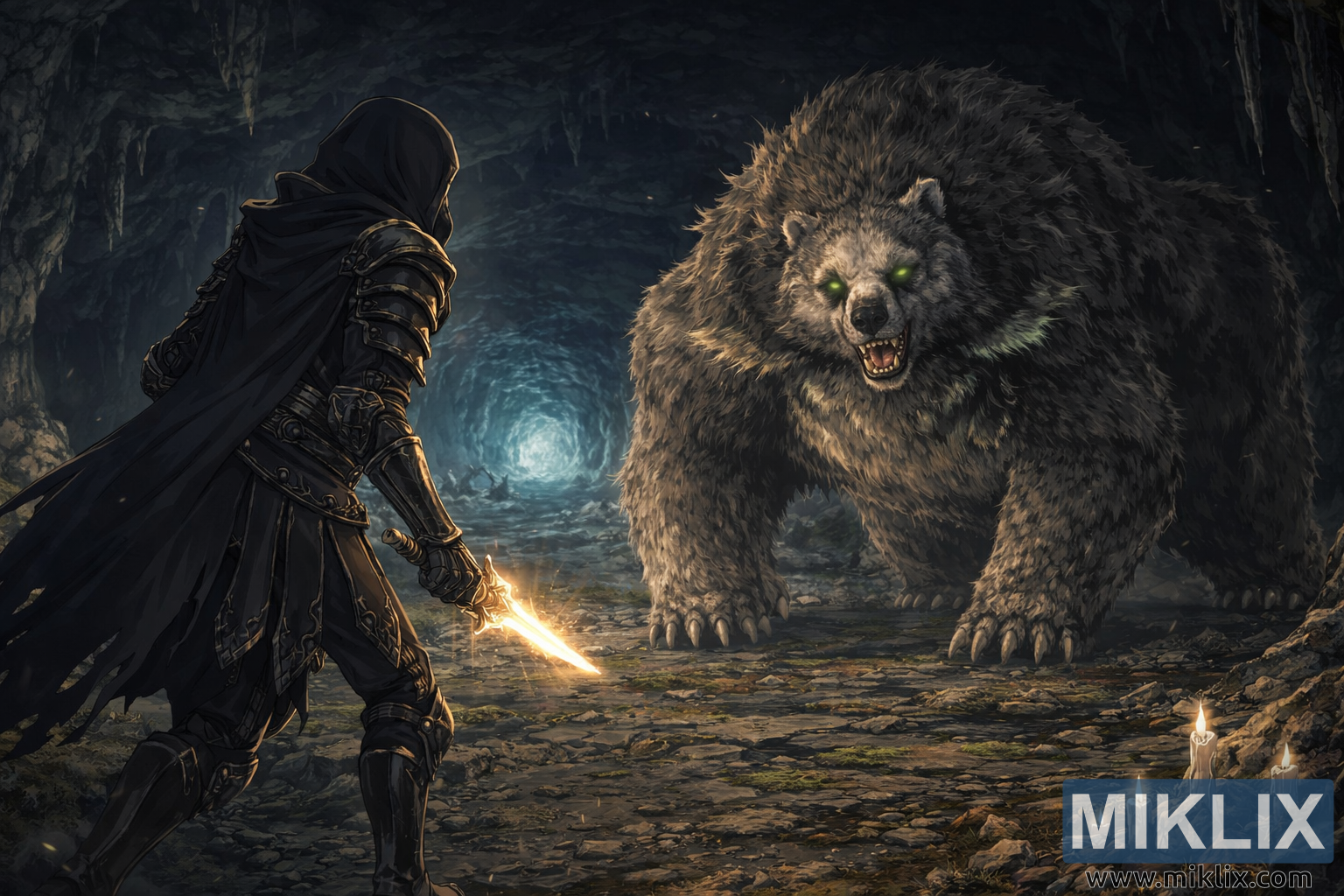 Image: Tarnished vs Runebear – Earthbore Cave Standoff