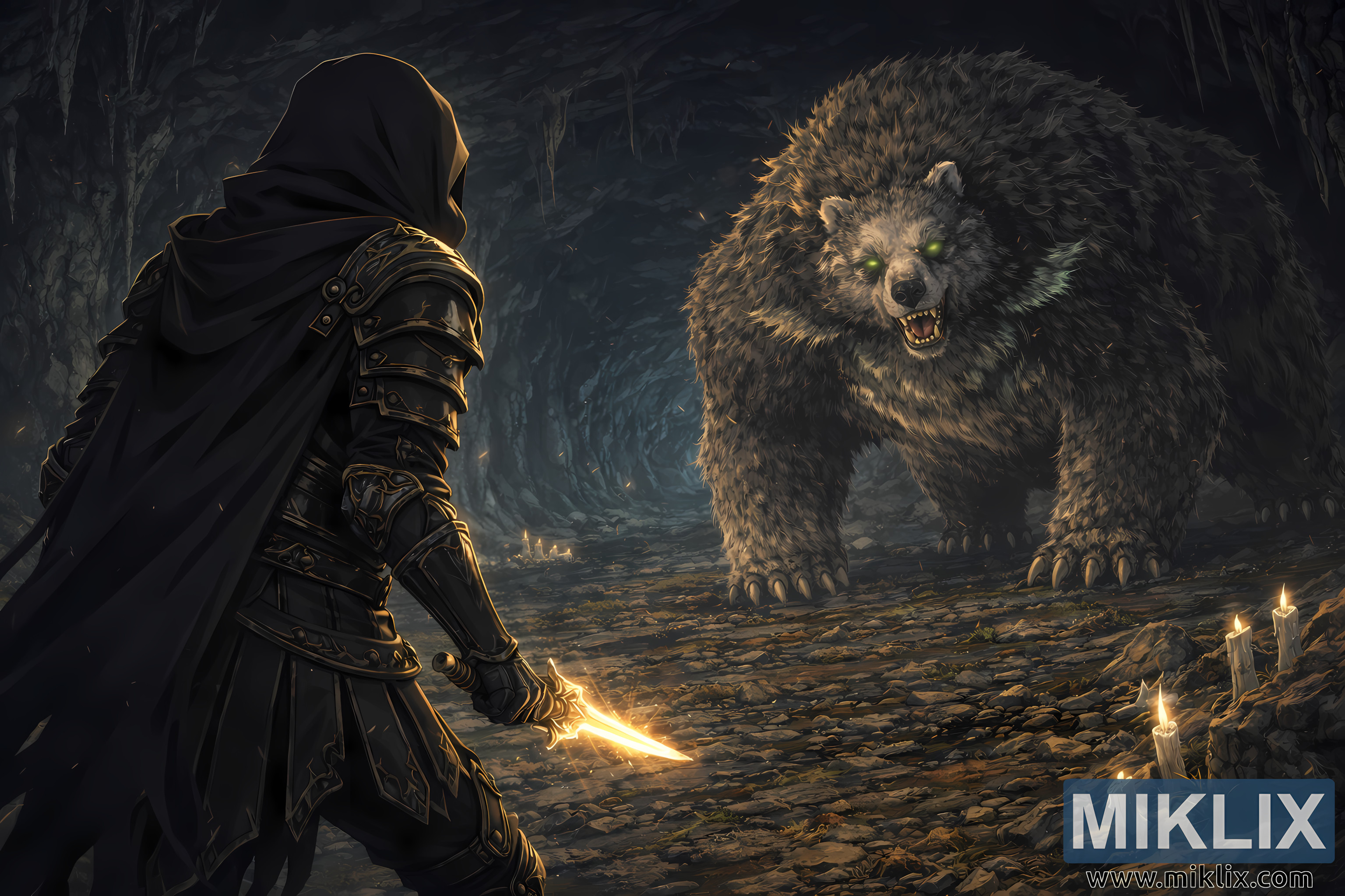 Dominating the right side of the scene is the towering Runebear, an enormous beast rendered with thick, textured fur in blended hues of gray, brown, and muted green. The creature’s posture is low and braced, shoulders hunched and claws spread wide, communicating both power and alertness. Its glowing green eyes pierce through the darkness, creating a stark visual contrast against the cool blue shadows of the cave interior. The bear’s partially open jaws reveal sharp teeth and a low snarl, frozen in a moment of wary intimidation rather than full aggression. The environment surrounding them is rich with atmospheric detail: jagged stalactites hang from the ceiling, thin beams of bluish light filter in from distant openings, and fine dust particles drift through the air, enhancing the sense of scale and depth. Along the cave walls and near the foreground rocks, small candles burn with gentle flickering flames, casting warm amber highlights that balance the cooler tones of the background tunnel. The rocky ground is uneven and littered with pebbles and cracks, adding texture and realism to the fantasy setting.