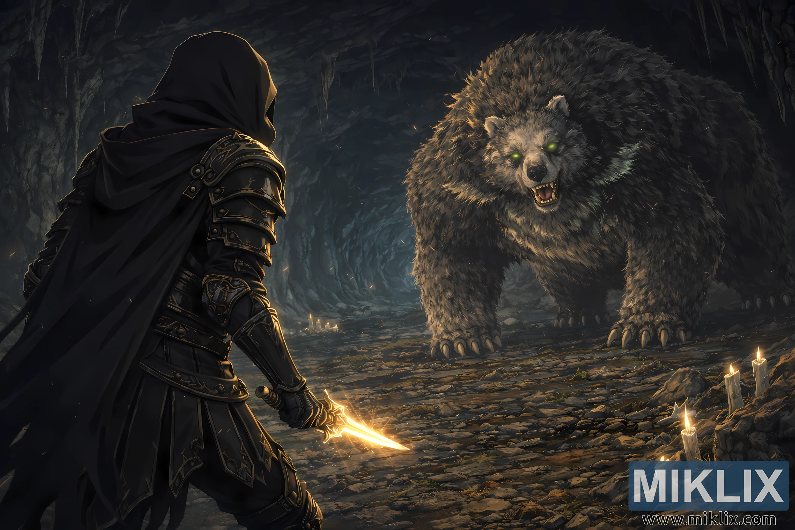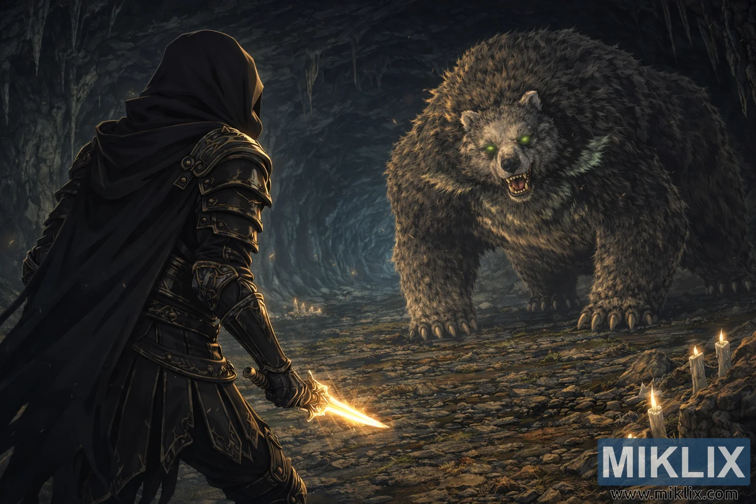 Cinematic anime-style fantasy artwork showing the Tarnished in dark armor confronting a massive Runebear inside a moody candle-lit cave just moments before combat.
